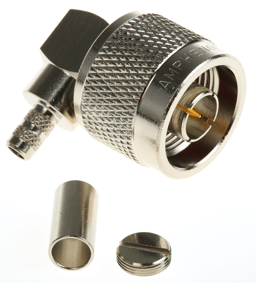 This is Amphenol 50Ω Right Angle Cable Mount N Connector Plug RG58 C/U RG58/U manufactured by Amphenol RF. The manufacturer part number is N1112B1-001-NT3G-1-50. The body is nickel plated for adorable look and strength. The product is available in cable mount configuration. In addition, male is the available "Gender" of the product. It has right angle body orientation. It is a typical rg58 c/u, rg58/u cable. This coaxial connector is a type of n connector. The high-quality gold is used as contact plating material. It allows crimp termination method. Furthermore, the product has 0 to 6ghz operating frequency range. It has an impedance value of 50ω. The product is made from sturdy brass materials.
