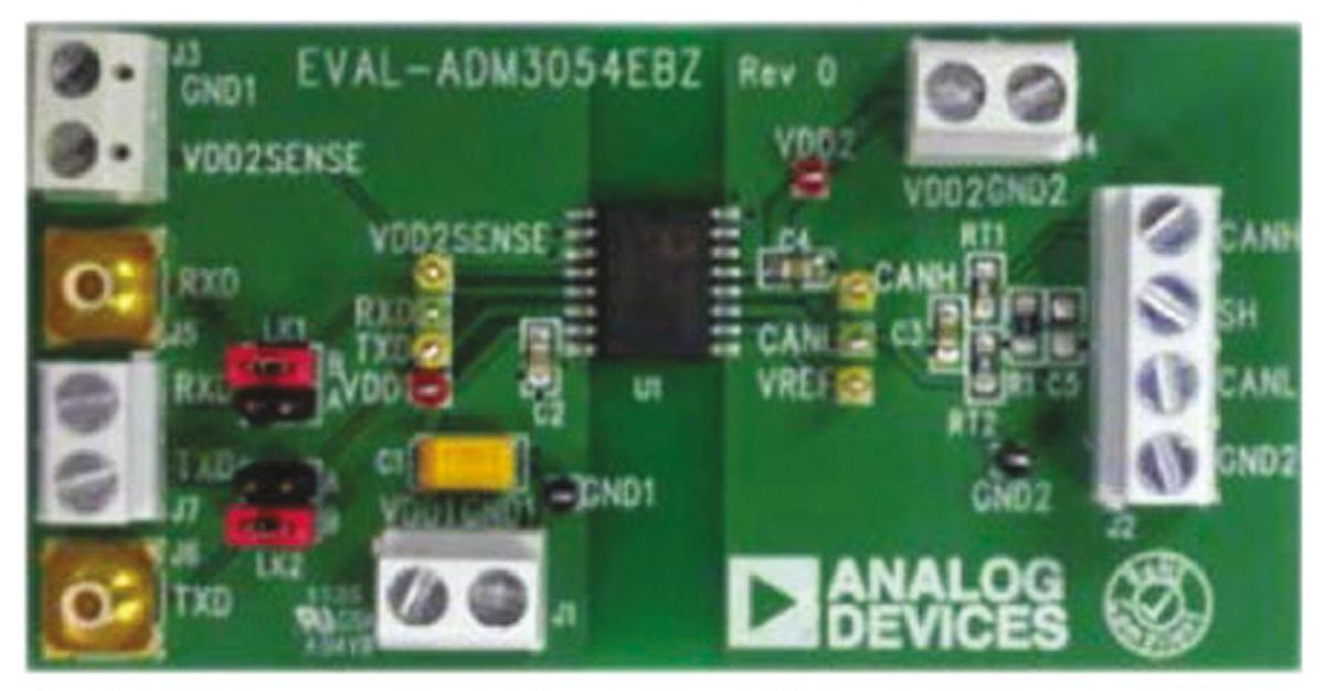 This is CAN Bus Evaluation Board for ADM3054 manufactured by Analog Devices. The manufacturer part number is EVAL-ADM3054EBZ. Featured Device adm3054. The kit is classified as evaluation kit.