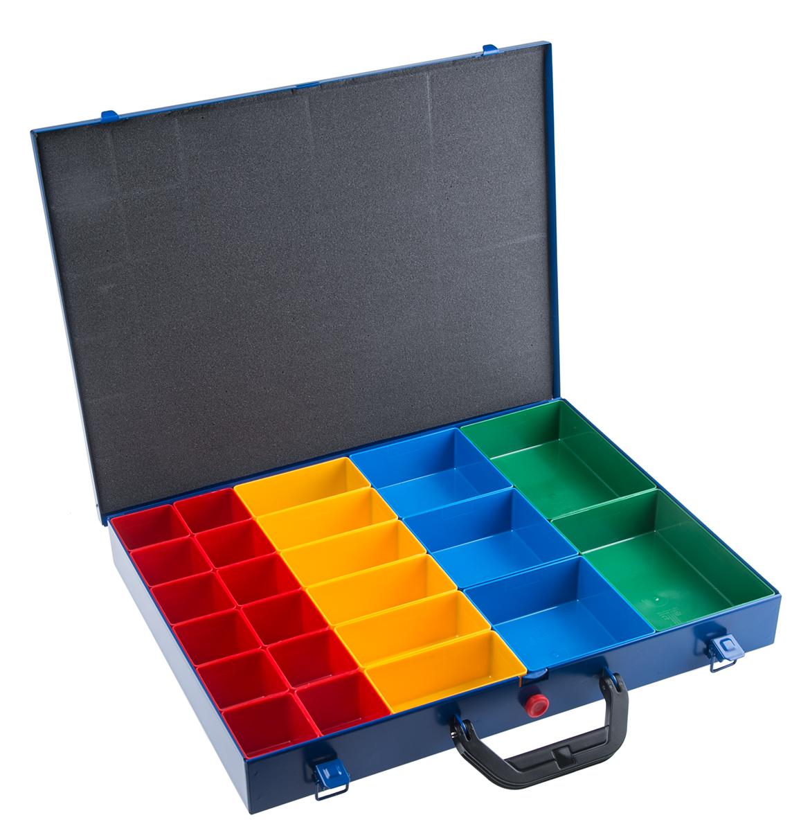 This is 23 Cell Blue Sheet Metal Adjustable Compartment Box 65mm x 440mm x 370mm manufactured by RS Pro. The manufacturer part number is 789-7766. It has adjustable compartments yes . The product is made from highly stable and reliable polystyrol, powder coated sheet metal. It has a decent blue colour. It includes foam yes . In addition, the height is 65mm. Furthermore, the product is 440mm wide. The product comes in 370mm depth. It has about 23 compartments .