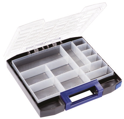 This is RS Pro 12 Cell Blue PC PP Compartment Box 55mm x 354mm x 323mm manufactured by Raaco. The manufacturer part number is 134835. It has about 12 compartments . It has a decent blue colour. The product is made from highly stable and reliable pc, pp. It has a model number boxxser 55 6x6-12. In addition, the height is 55mm. Furthermore, the product is 354mm wide. The product comes in 323mm depth.