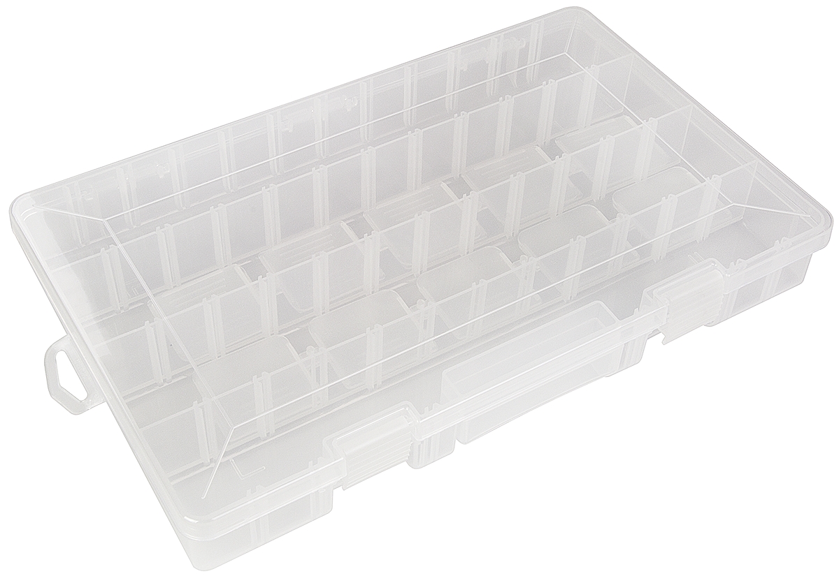 This is 23 Cell PP Adjustable Compartment Box 47.63mm x 355.6mm x 228.6mm manufactured by RS PRO. The manufacturer part number is 3700. It has about 23 compartments . The product is made from highly stable and reliable pp. It includes a transparent lid yes . In addition, the height is 47.63mm. Furthermore, the product is 355.6mm wide. The product comes in 228.6mm depth. It has adjustable compartments yes .