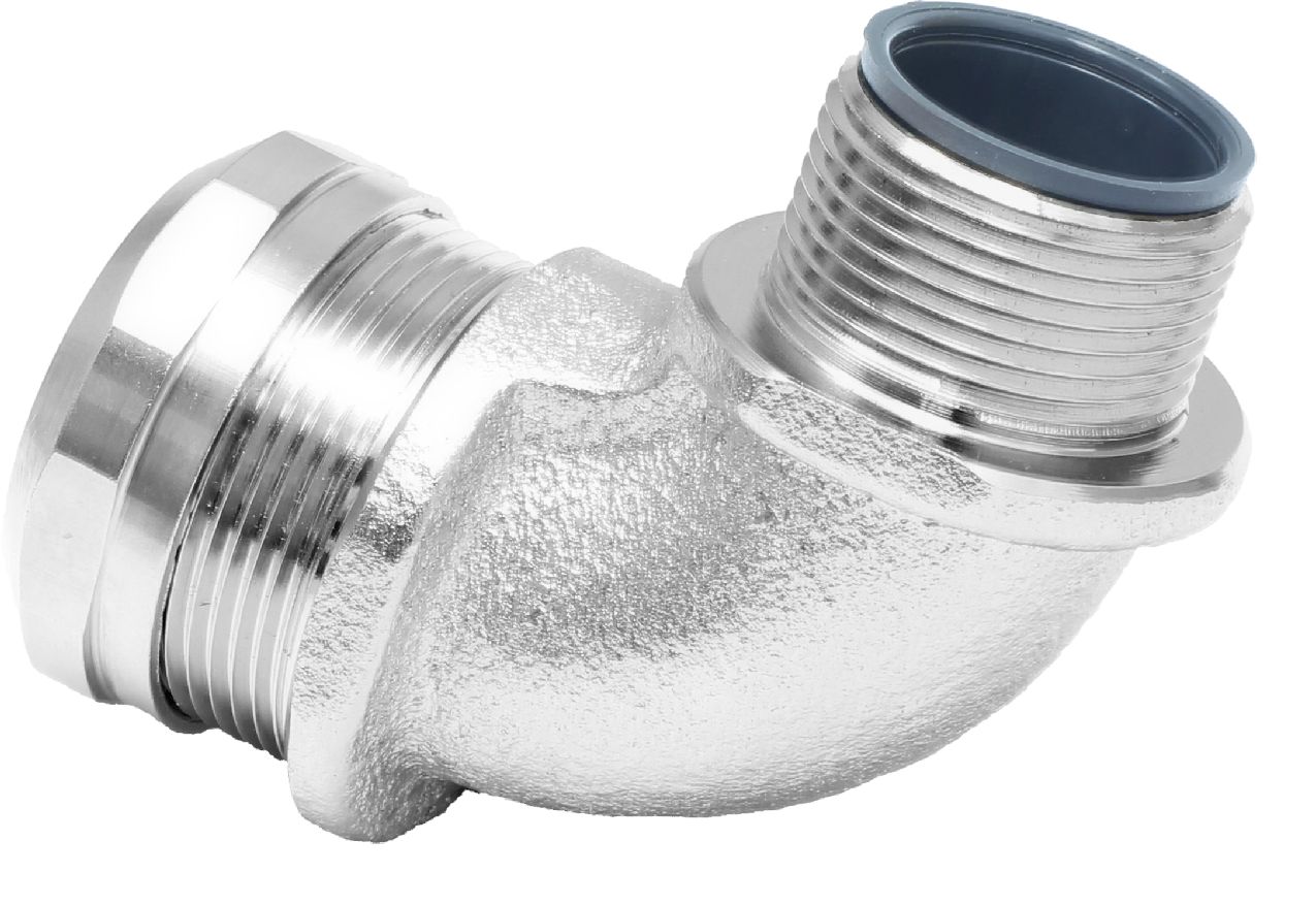 This is M32 90° Elbow Cable Conduit Fitting Silver 32mm nominal size manufactured by RS PRO. The manufacturer part number is 214-9577. A quality product with a nice nickel plated finish. The product is made from highly stable and reliable brass. It is IP rated with ip67. It has a decent silver colour. This 90° elbow tool is easy to use with versatile applications in various settings. It has a typical thread size of m32. It has about 32mm nominal size .