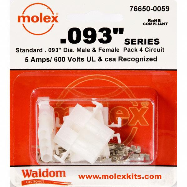 This is manufactured by Molex. The manufacturer part number is 0766500059. The circuit plug, receptacle is designed to provide robust applications in a variety of specific settings. It is assigned with possible HTSUS value of 8536.69.8000. The product is not applicable. The product standard .093, is a highly preferred choice for users. Its typical moisture sensitivity level is 1 (unlimited). In addition, retail package is the available packaging type of the product. Values include - 24 pcs - 4 position circuit plug, receptacle, 22 ~ 18 awg crimp terminals . It has a long 19 weeks standard lead time. The molex's product offers user-desired applications. Moreover, it corresponds to 76650, a base product number of the product. The product is designated with the ear99 code number.