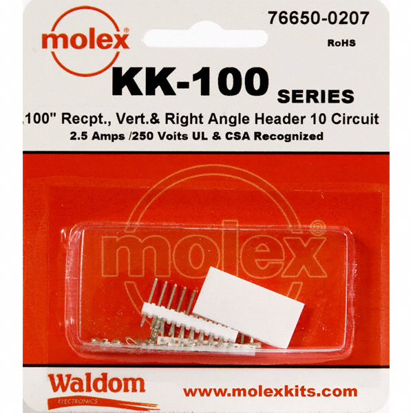 This is manufactured by Molex. The manufacturer part number is 0766500207. The rectangular - contact, header, housing is designed to provide robust applications in a variety of specific settings. It is assigned with possible HTSUS value of 8536.69.8000. The product kk, is a highly preferred choice for users. The product is rohs3 compliant. Its typical moisture sensitivity level is 1 (unlimited). In addition, retail package is the available packaging type of the product. Values include - 14 pcs - assorted 10 circuit header, housing, 30 ~ 22 awg crimp terminals . It has a long 14 weeks standard lead time. The molex's product offers user-desired applications. Moreover, it corresponds to 76650, a base product number of the product. The product is designated with the ear99 code number.