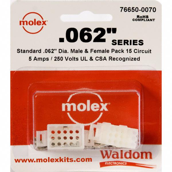 This is manufactured by Molex. The manufacturer part number is 0766500070. The circuit plug, receptacle is designed to provide robust applications in a variety of specific settings. It is assigned with possible HTSUS value of 8536.69.8000. The product standard .062, is a highly preferred choice for users. The product is rohs3 compliant. Its typical moisture sensitivity level is 1 (unlimited). In addition, retail package is the available packaging type of the product. Values include - 36 pcs - 15 position circuit plug, receptacle, 24 ~ 18 awg crimp terminals . The molex's product offers user-desired applications. Moreover, it corresponds to 076650, a base product number of the product. The product is designated with the ear99 code number.