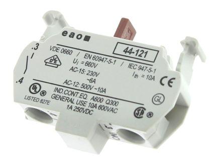 This is Series 44 Contact Block 1NO Screw terminal manufactured by EAO. The manufacturer part number is 44.121.00. The product has a current rating of 10 a. Moreover, the product has a nominal 600 v voltage rating. The product eao series 44, is a highly preferred choice for users. It includes a body/fixing collar no . The contact is equipped with 1no configuration. Its block type is contact block . The terminal is a screw type.