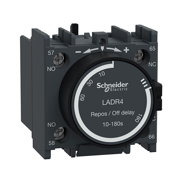 This is TeSys D Series Analogue (OFF Delay) Pneumatic Timer Range 10 → 180s NO/NC Contacts manufactured by Schneider Electric. The manufacturer part number is LADR4. Better World Verification Options - green premium. Its timer range is 10 → 180s . The product has a current rating of 10 a. The product is available in front mount configuration. Moreover, the product has a nominal 690 v voltage rating. The product d, is a highly preferred choice for users. It is a type of pneumatic timer accessory. The contact is equipped with 1no + 1nc configuration. It features tesys range. Is it a better world product? yes. The product is highly suitable for tesys deca cad, tesys deca lc1d, tesys f cr1f, tesys f lc1f. Moreover, it has a/an analogue (off delay) timer function . The product tesys, is a highly preferred choice for users. It is a type of auxiliary contact block accessory. In addition, box is the available packaging type of the product. The product is suitable for use with contactors. It has a long 5 weeks standard lead time. The schneider electric's product offers user-desired applications.