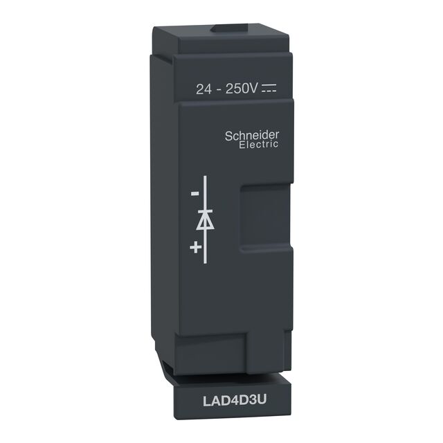 This is TeSys Suppressor Diode for use with 3P LC1D40A...D80A 4P LC1DT60A...DT80A manufactured by Schneider Electric. The manufacturer part number is LAD4D3U. Better World Verification Options - green premium. Is it a better world product? yes. It is a type of suppressor module accessory. It features tesys range. The product is highly suitable for 3p lc1d40a...d80a, 4p lc1dt60a...dt80a. It is assigned with possible HTSUS value of 8536.30.8000. The product tesys, is a highly preferred choice for users. The product is rohs3 compliant. It is a type of suppressor accessory. In addition, it is reach unaffected. Its typical moisture sensitivity level is not applicable. In addition, box is the available packaging type of the product. The product is suitable for use with lc1d40a, lc1d80a, lc1dt60a and lc1dt80a series. It has a long 5 weeks standard lead time. The schneider electric's product offers user-desired applications. The product is designated with the ear99 code number.