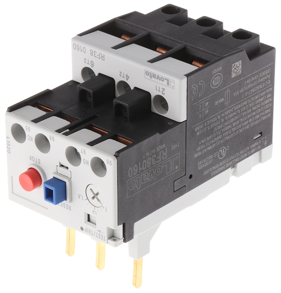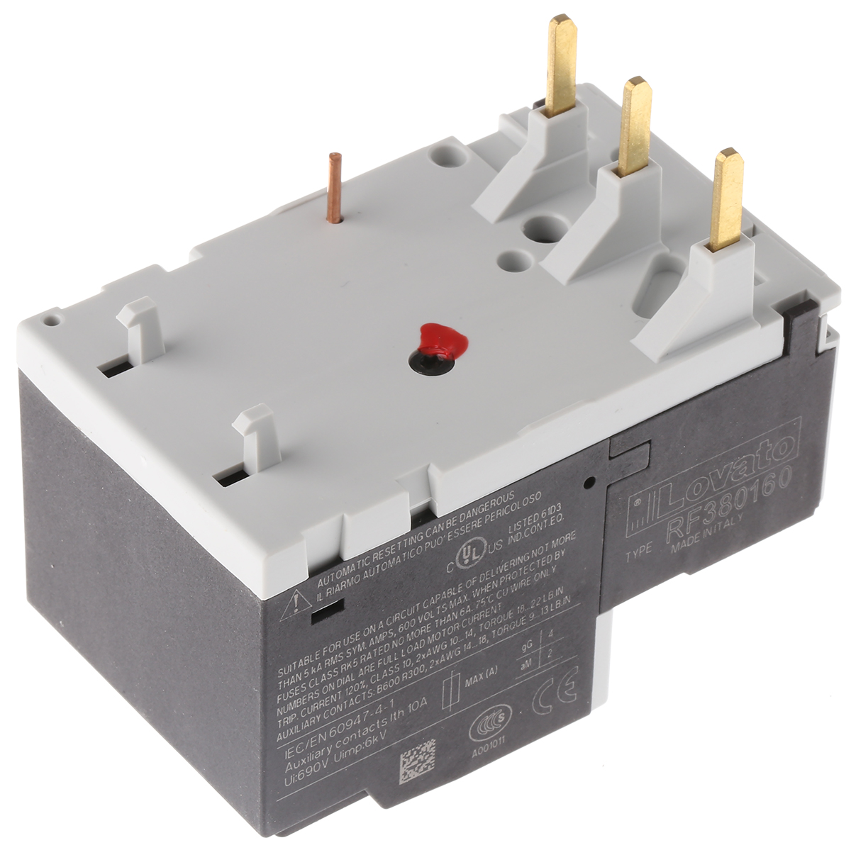This is Thermal Overload Relay - 1 → 1.6 A F.L.C 1.6 A Contact Rating 3P manufactured by Lovato. The manufacturer part number is RF380160. Moreover, it has a/an automatic, manual reset method . Whereas, the minimum operating temperature of the product is -25°c. It is created with 3p pole configuration . The product has -25 → +60 °c of operating temperature range. The rated contact current is 1.6 a. The product rf38, is a highly preferred choice for users. Its accurate length is 81mm. Furthermore, the product is 45mm wide. The product comes in 80.7mm depth. It is composed of [Number of Auxiliary Contacts] auxiliary contacts. It has about 1 → 1.6 a FLC motor rating . The integrated contact has 690 v of voltage rating. It has a maximum operating temperature of +60°c. The terminal is a screw type.