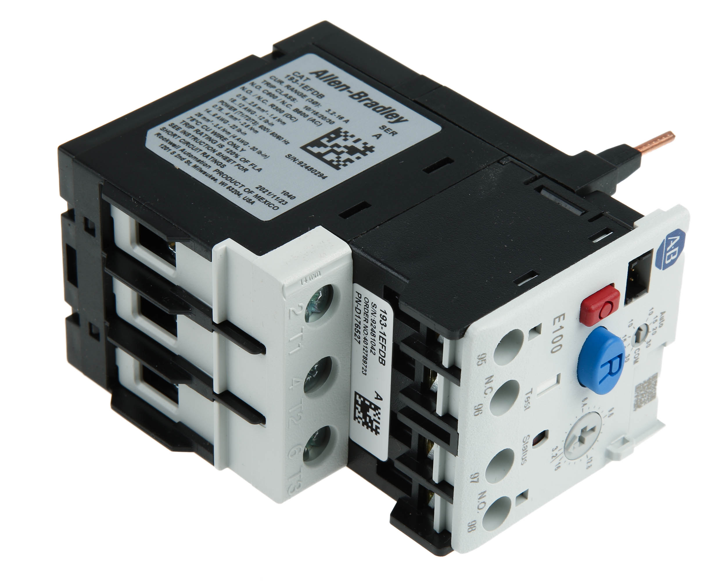 This is Overload Relay - 1NC + 1NO 3.2 → 16.0 A F.L.C 16 A Contact Rating 3P manufactured by Rockwell Automation. The manufacturer part number is 193-1EFDB. The rated contact current is 16 a. It has about 3.2 → 16.0 a FLC motor rating . It features e100 range. The normal state configuration includes 1nc + 1no. It is created with 3p pole configuration .