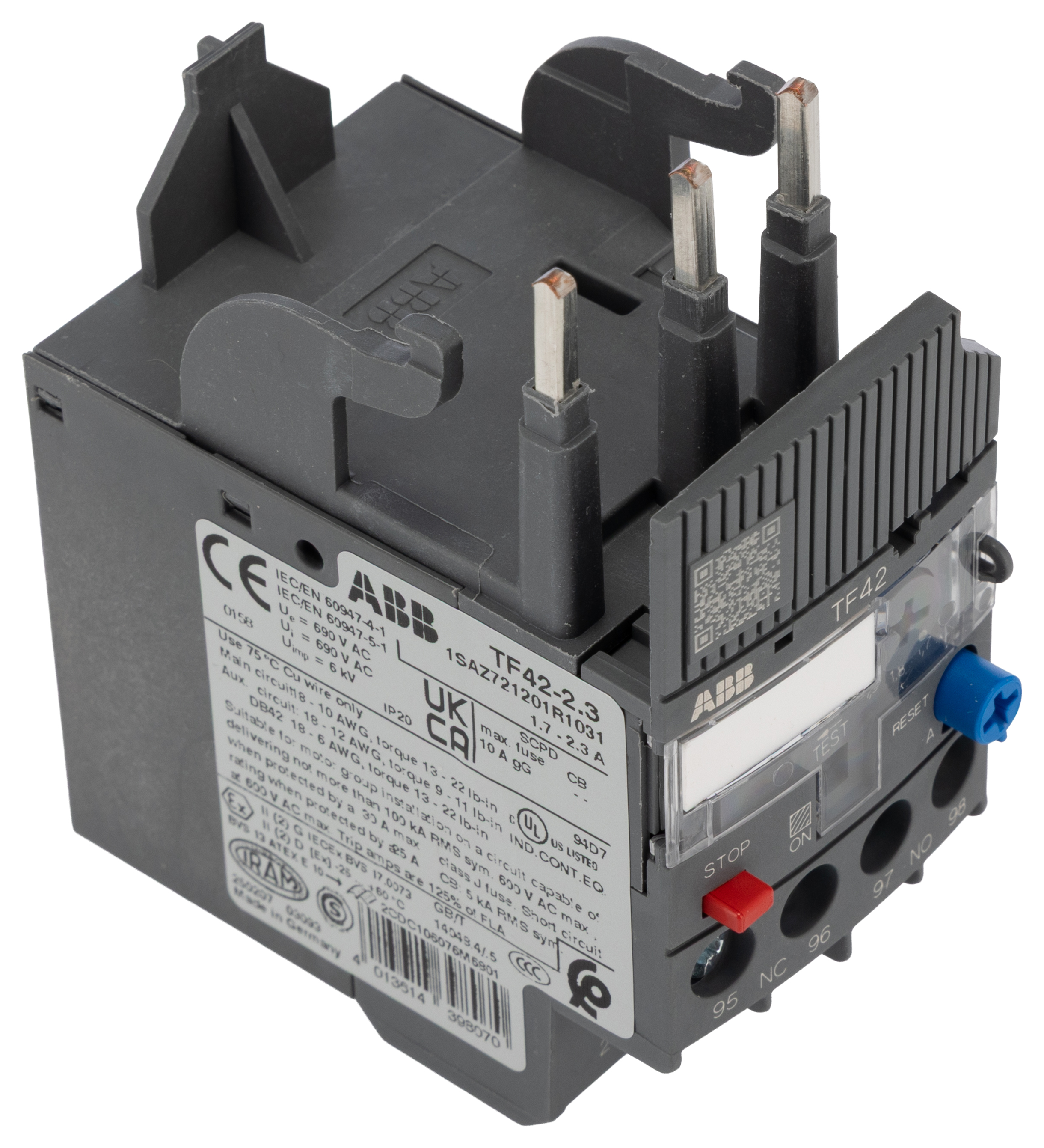 This is Thermal Overload Relay - 1NO + 1NC 1.7 → 2.3 A F.L.C 2.3 A Contact Rating 2 W 3P manufactured by ABB. The manufacturer part number is 1SAZ721201R1031 TF42-2.3. Moreover, it has a/an automatic, manual reset method . Whereas, the minimum operating temperature of the product is -25°c. It is created with 3p pole configuration . The product has -25 → +60 °c of operating temperature range. The rated contact current is 2.3 a. The product tf42, is a highly preferred choice for users. Its accurate length is 88.3mm. The product is available in direct contactor style. Furthermore, the product is 45mm wide. The product comes in 70.5mm depth. It is composed of [Number of Auxiliary Contacts] auxiliary contacts. The normal state configuration includes 1no + 1nc. It has about 1.7 → 2.3 a FLC motor rating . It features af range range. Feature 2 w of power rating. The integrated contact has 690 v ac/dc of voltage rating. It has a maximum operating temperature of +60°c. The terminal is a screw type.