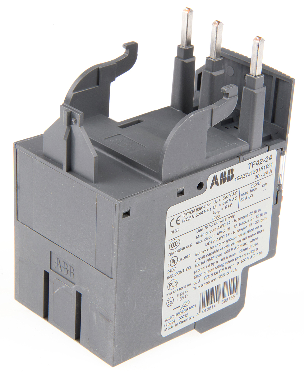 This is Thermal Overload Relay - 1NO + 1NC 20 → 24 A F.L.C 24 A Contact Rating 2.6 W 3P manufactured by ABB. The manufacturer part number is 1SAZ721201R1051 TF42-24. Moreover, it has a/an automatic, manual reset method . Whereas, the minimum operating temperature of the product is -25°c. It is created with 3p pole configuration . The product has -25 → +60 °c of operating temperature range. The rated contact current is 24 a. The product tf42, is a highly preferred choice for users. Its accurate length is 88.3mm. The product is available in direct contactor style. Furthermore, the product is 45mm wide. The product comes in 70.5mm depth. Features 600 v supply voltage. The normal state configuration includes 1no + 1nc. It has about 20 → 24 a FLC motor rating . It features af range range. Feature 2.6 w of power rating. The integrated contact has 690 v ac/dc of voltage rating. It has a maximum operating temperature of +60°c. The terminal is a screw type. It is composed of [Number of Auxiliary Contacts] auxiliary contacts.