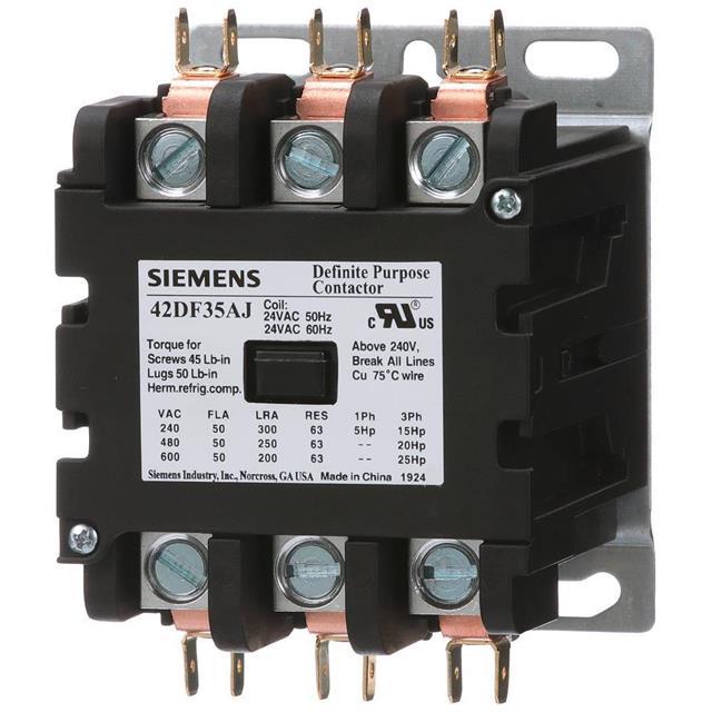 This is manufactured by Siemens. The manufacturer part number is 42DF35AJ. It is assigned with possible HTSUS value of 8536.41.0045. The coil voltage of the product is 24vac. Moreover, it has screw terminal terminal style. The product has 70°c operating temperature range. The product's switching voltage is 600vac - max. In addition, it is reach unaffected. It is shipped in box package . It also has a 3pst-no (3 form a) contact form. Its typical moisture sensitivity level is not applicable. It has a long 15 weeks standard lead time. It has a contact current rating of 50 a. The splendid features of the product include auxiliary contacts. The product is available in chassis mount configuration. The product is designated with the ear99 code number. Moreover, it corresponds to 42df, a base product number of the product.