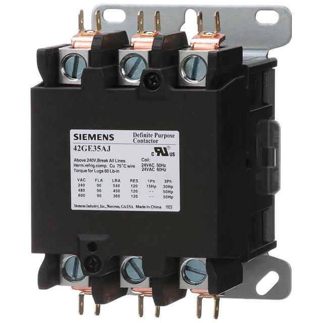 This is manufactured by Siemens. The manufacturer part number is 42GE35AJ. It is assigned with possible HTSUS value of 8536.49.0065. The coil voltage of the product is 24vac. Moreover, it has screw terminal terminal style. The product has 70°c operating temperature range. The product's switching voltage is 600vac - max. In addition, it is reach unaffected. It is shipped in box package . It also has a 3pst-no (3 form a) contact form. Its typical moisture sensitivity level is not applicable. It has a long 15 weeks standard lead time. It has a contact current rating of 90 a. The splendid features of the product include auxiliary contacts. The product is available in chassis mount configuration. The product is designated with the ear99 code number. Moreover, it corresponds to 42ge, a base product number of the product.