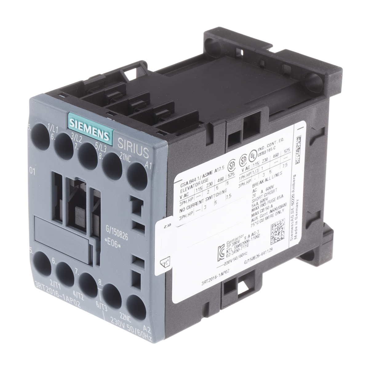 This is Sirius Innovation 3RT2 3 Pole Contactor 3NO 9 A (AC3) 4 kW (AC3) 230 V ac Coil manufactured by Siemens. The manufacturer part number is 3RT2016-1AP02. The coil voltage of the product is 230 v ac. It has 3p pole and throw configuration. Furthermore, the product is 45mm wide. It features sirius 3rt range. The rated contact current is 9 a. It has a maximum operating temperature of +60°c. The terminal is a screw type. It has 230 v ac control voltage . Its accurate length is 57.5mm. Is it a better world product? yes. The product size s00, 3rt2, is a highly preferred choice for users. The product comes in 73mm depth. The product is available in din rail style. It is composed of [Number of Auxiliary Contacts] auxiliary contacts. The normal state configuration includes 3no. In addition, it has a standard 1nc auxiliary contact configuration . Feature 4 kw of power rating. The integrated contact has 400 v ac of voltage rating. It has equipped with 3 poles. Whereas, the minimum operating temperature of the product is -25°c.