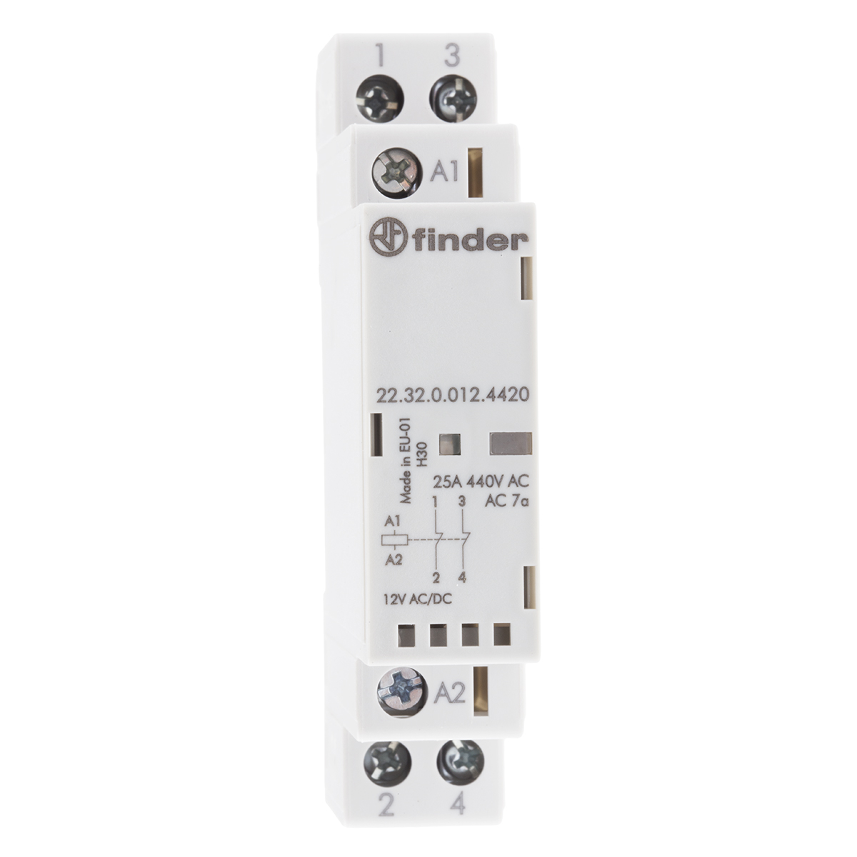 This is 22 2 Pole Contactor 25 A 2 VA 12 V Coil manufactured by Finder. The manufacturer part number is 22.32.0.012.4420. The coil voltage of the product is 12 v dc. It has 2p pole and throw configuration. Furthermore, the product is 17.5 mm wide. It performs basic function of motor control. contactor is a versatile product designed to provide user-defined applications. It has a maximum operating temperature of 50°c. The terminal is a screw type. Whereas, the minimum operating temperature of the product is -20°c. Its accurate length is 84mm. In addition, it has a standard 2 nc auxiliary contact configuration . It has a din rail type mount . The product 22, is a highly preferred choice for users. The product comes in 60.8mm depth. The normal state configuration includes 2 nc. Moreover, it has about 250, 440v dc contact voltage . Feature 1.25w of power rating. It has equipped with 2 poles.