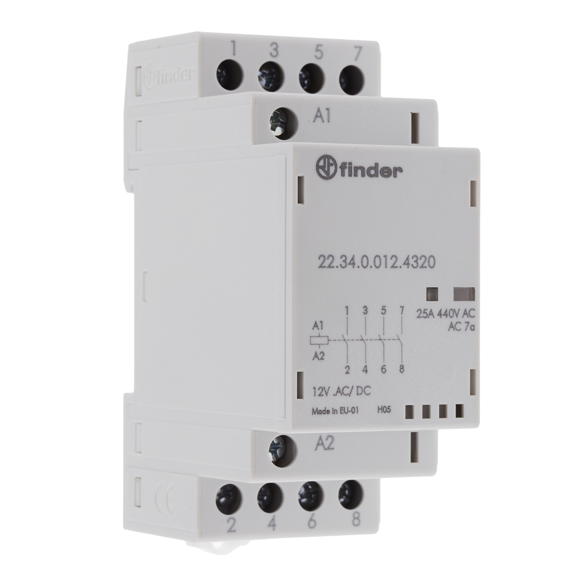 This is 4NO DIN Rail Non-Latching Relay 12V ac/dc Coil 25 A manufactured by Finder. The manufacturer part number is 22.34.0.012.4320. It has a maximum operating temperature of +50°c. The rated contact current is 25 a. The product 22, is a highly preferred choice for users. The coil voltage of the product is 12 v ac/dc. Its accurate length is 35mm. The product is available in din rail style. The product comes in 60.8mm depth. Whereas, the minimum operating temperature of the product is -20°c. The integrated contact has 250 v of voltage rating. It has equipped with 4 poles. The terminal is a screw type.