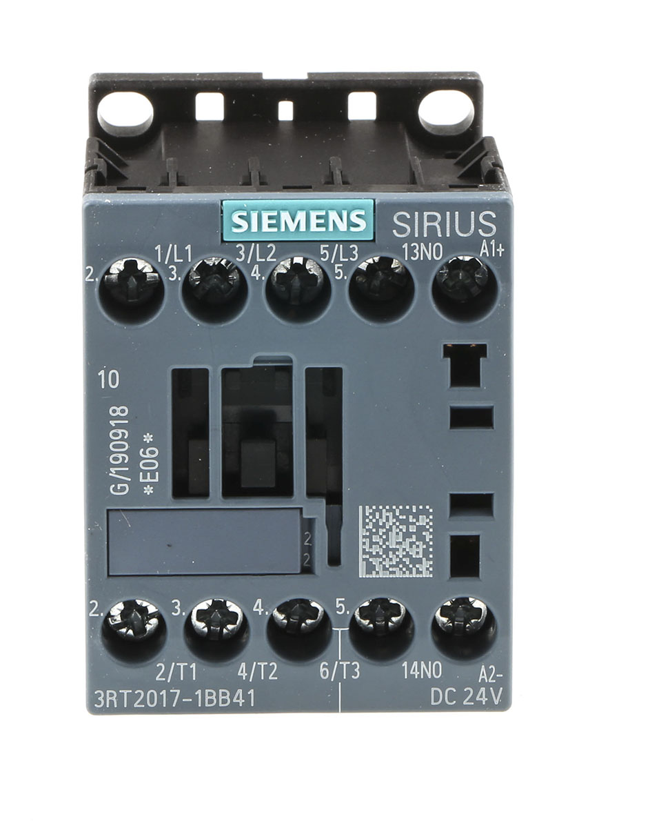 This is Sirius Innovation 3RT2 3 Pole Contactor 3NO 12 A (AC3) 5.5 kW (AC3) 24 V dc Coil manufactured by Siemens. The manufacturer part number is 3RT2017-1BB41. It has a maximum operating temperature of +60°c. Is it a better world product? yes. The normal state configuration includes 3no. The rated contact current is 12 a. The product size s00, 3rt2, is a highly preferred choice for users. Whereas, the minimum operating temperature of the product is -25°c. The coil voltage of the product is 24 v dc. Its accurate length is 57.5mm. Furthermore, the product is 45mm wide. The product comes in 73mm depth. It is composed of [Number of Auxiliary Contacts] auxiliary contacts. It features sirius 3rt range. In addition, it has a standard 1no auxiliary contact configuration . Feature 5.5 kw of power rating. The integrated contact has 400 v ac of voltage rating. It has equipped with 3 poles. The terminal is a screw type.