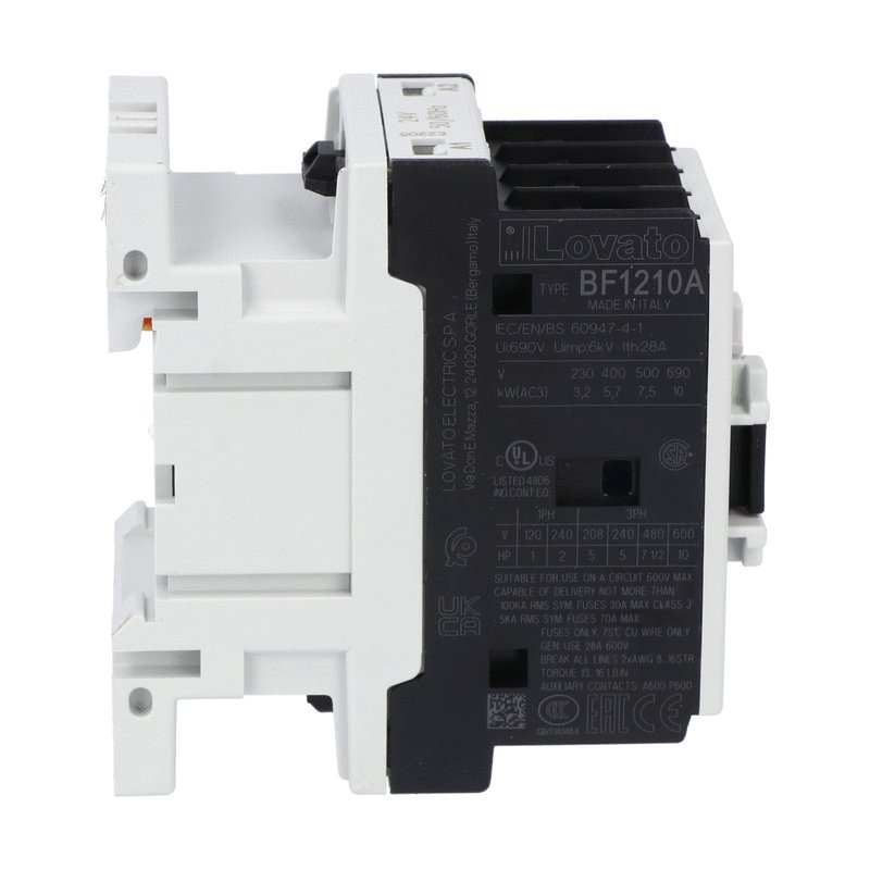 This is BF 3 Pole Contactor 3NO 12 A 5.5 kW 24 V ac Coil manufactured by Lovato. The manufacturer part number is BF1210A024. It performs basic function of 3-phase motor monitoring. It has a maximum operating temperature of +70°c. The rated contact current is 12 a. The product bf, is a highly preferred choice for users. Whereas, the minimum operating temperature of the product is -50°c. The coil voltage of the product is 24 v ac. Its accurate length is 81mm. It has 3p pole and throw configuration. The product is available in din rail style. Furthermore, the product is 45mm wide. The product comes in 80.7mm depth. It is composed of [Number of Auxiliary Contacts] auxiliary contacts. The normal state configuration includes 3no. It features orange range. In addition, it has a standard 1no auxiliary contact configuration . Feature 5.5 kw of power rating. The integrated contact has 440 v ac of voltage rating. It has equipped with 3 poles. The terminal is a screw type.