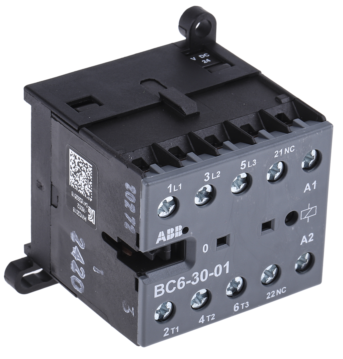 This is B Range BC6 3 Pole Contactor 3NO 9 A 4 kW 24 V dc Coil manufactured by ABB. The manufacturer part number is BC6-30-01-01. It performs basic function of load control. It has a maximum operating temperature of +55°c. The rated contact current is 9 a. It has 24 v dc control voltage . The product b, is a highly preferred choice for users. Additionally, it can withstand 600v ac load voltage . The coil voltage of the product is 24 v dc. Its accurate length is 57.5mm. The product is available in din rail mount style. Furthermore, the product is 52.5mm wide. The product comes in 46.5mm depth. It is composed of [Number of Auxiliary Contacts] auxiliary contacts. The normal state configuration includes 3no. Whereas, the minimum operating temperature of the product is -25°c. It features bc6 range. In addition, it has a standard 1nc auxiliary contact configuration . Feature 4 kw of power rating. The integrated contact has 690 v ac of voltage rating. It has equipped with 3 poles. The terminal is a screw type.