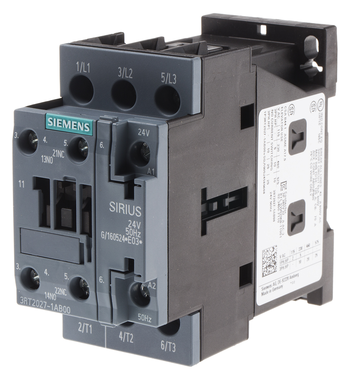 Contactors – 3RT2 Range The 3RT2 contactors are climate-proof and are suitable and tested for use worldwide, sizes S00 to S2, up to 37 kW Size S00, up to 7.5 kW Size S0, up to 18.5 kW Size S2, up to 37 kW Screw connection / Spring Clamp Impulse voltage resistance 6 kV Insulation voltage 690 V Real loss power only 4 W Designation K according to DIN 40719 (extendable to IEC 204-2) & IEC 750; Q according to DIN EN 61346-2 Note Screw terminals can only be used with screw terminal overloads and spring terminals can only be used with spring terminal overloads. Approvals CE, UL, CSA, CCC Siemens Sirius Range Contactor & Control Relays Siemens control gear for feeders up to 5.5kW. The complementary nature of the devices allows fast and simple assembly, for example, of motor starters and reversers. A perfect match between contactors, overloads, circuit breakers and accessories for the same power ratings provides a uniform panel appearance and the standard widths with no side-by-side mounting derating allows for space saving.