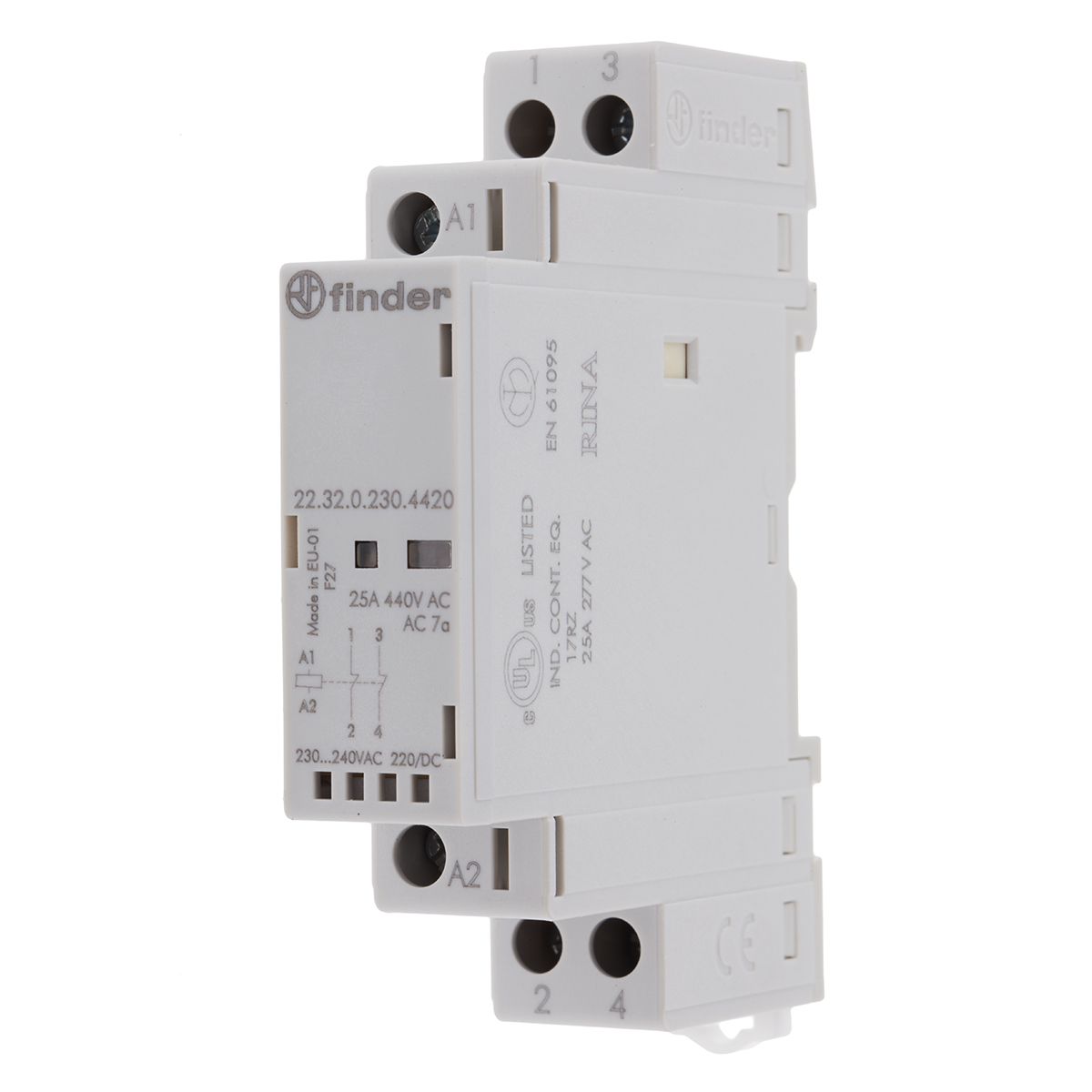 This is DPNC Non-Latching Relay DIN Rail 240V ac Coil 25 A manufactured by Finder. The manufacturer part number is 22.32.0.230.4420. Whereas, the minimum operating temperature of the product is -20°c. The rated contact current is 25 a. The product 22, is a highly preferred choice for users. The coil voltage of the product is 240 v ac. Its accurate length is 17.5mm. The product is available in din rail style. The product comes in 60.8mm depth. The normal state configuration includes 2nc. It has a maximum operating temperature of +50°c. It has equipped with 2 poles. The terminal is a screw type.