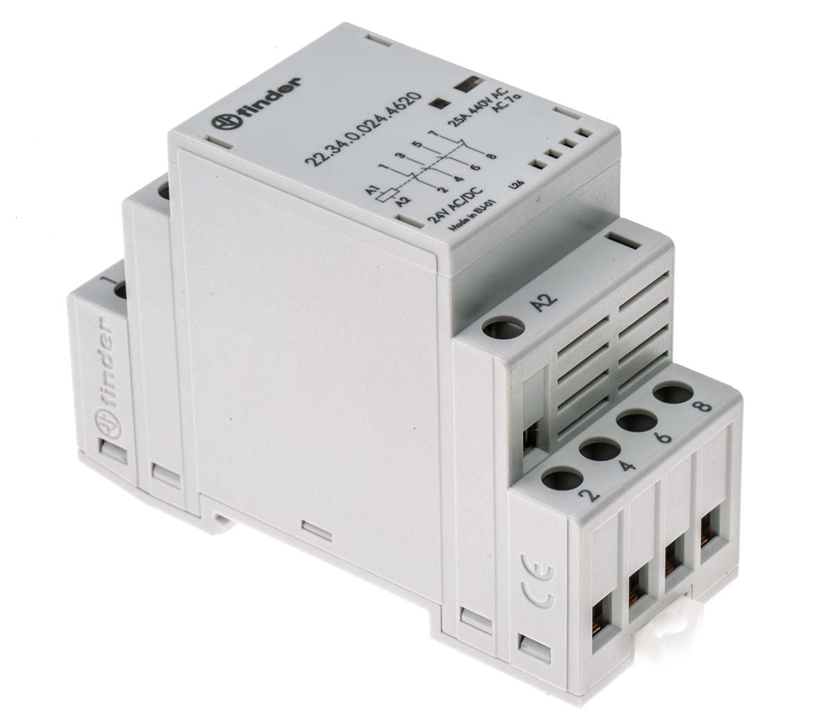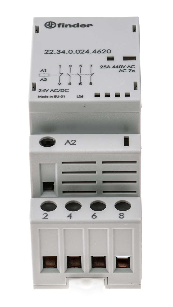 This is 22 Series 4 Pole Contactor 2NO/2NC 25 A 2 VA 24 V Coil manufactured by Finder. The manufacturer part number is 22.34.0.024.4620. It has a maximum operating temperature of +50°c. The normal state configuration includes 2no + 2nc. It has a typical 25a load current. The rated contact current is 25 a. The product 22, is a highly preferred choice for users. It has 24 v ac control voltage . The coil voltage of the product is 24 v ac. Its accurate length is 35mm. The product is available in din rail mounting style. Furthermore, the product is 35mm wide. The product comes in 60.8mm depth. Whereas, the minimum operating temperature of the product is -20°c. Feature 4 kw of power rating. The integrated contact has 250 v ac, 440 v ac of voltage rating. It has equipped with 4 poles. The terminal is a screw type.