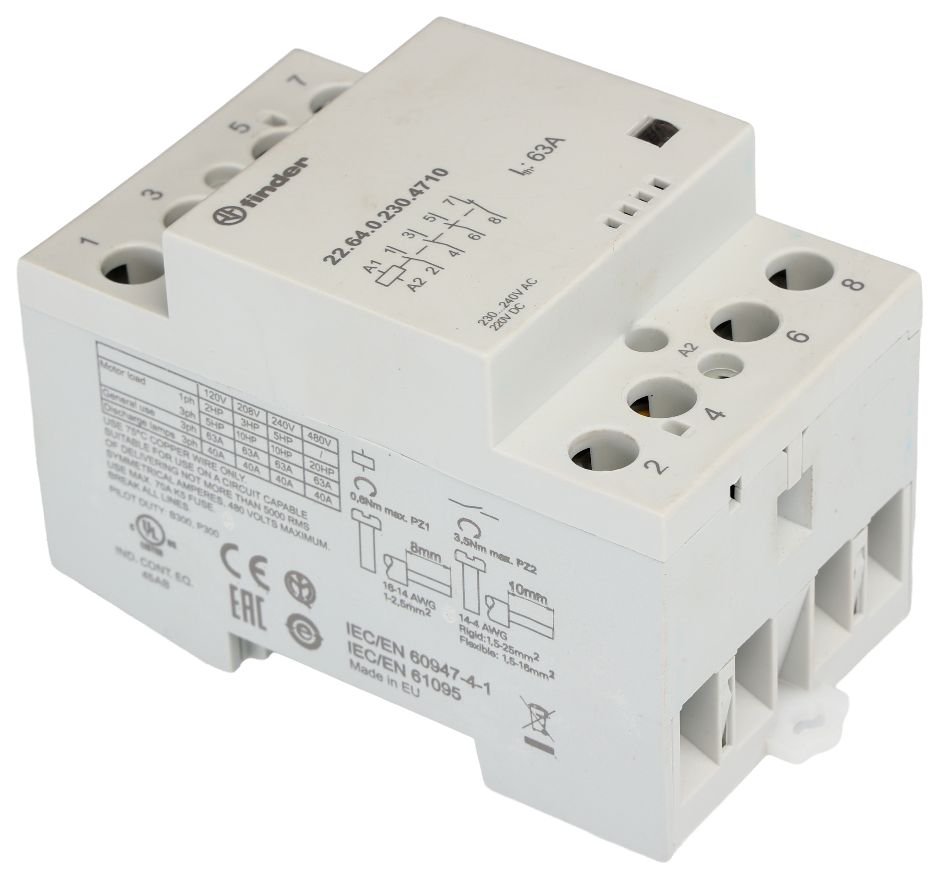 This is 3PDT Non-Latching Relay DIN Rail 240V ac Coil 63 A manufactured by Finder. The manufacturer part number is 22.64.0.230.4710. It has a maximum operating temperature of 55°c. The product 22, is a highly preferred choice for users. Whereas, the minimum operating temperature of the product is -5°c. The coil voltage of the product is 240 v ac. Its accurate length is 53.5mm. It has 3pdt pole and throw configuration. Furthermore, the product is 63.1 mm wide. The product comes in 63.1mm depth. The normal state configuration includes 3 no/1 nc. Moreover, it has about 480, 400v ac contact voltage . Feature 6va of power rating. contactor is a versatile product designed to provide user-defined applications. It has equipped with 4 poles. The terminal is a screw type. It has a din rail type mount .