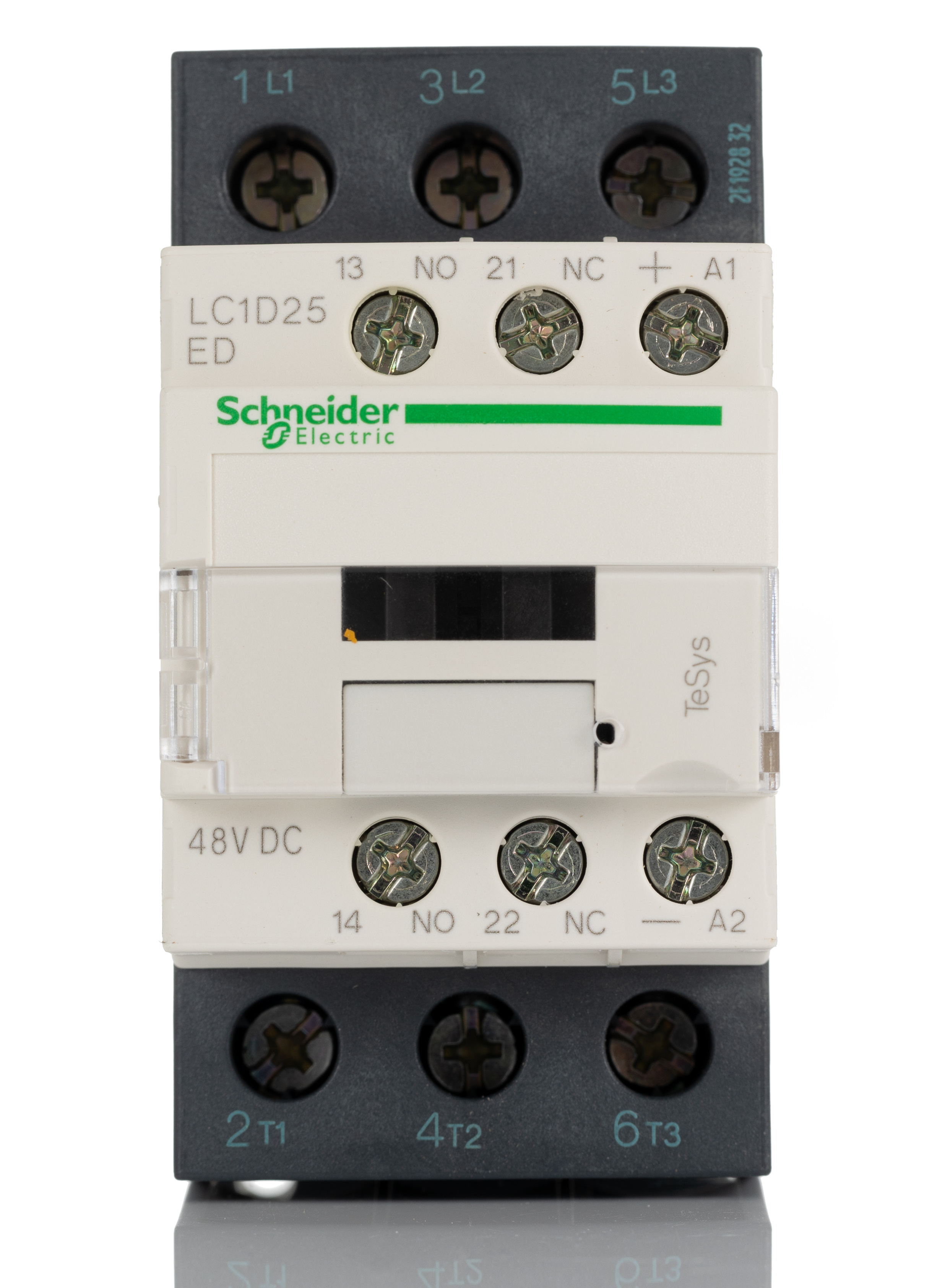 This is Tesys D LC1D 3 Pole Contactor 3NO 25 A 11 kW 48 V dc Coil manufactured by Schneider Electric. The manufacturer part number is LC1D25ED. The coil voltage of the product is 48 v dc. It has 3p pole and throw configuration. It features tesys d range. It has about 25a input current . It performs basic function of motor control. The rated contact current is 25 a. It has a maximum operating temperature of +60°c. The terminal is a screw type. It has 48 v dc control voltage . Its accurate length is 85mm. Better World Verification Options - green premium. Is it a better world product? yes. The product lc1d, is a highly preferred choice for users. The product comes in 99mm depth. The product is available in din rail mount, plate style. It is composed of [Number of Auxiliary Contacts] auxiliary contacts. The normal state configuration includes 3no. In addition, it has a standard 1no + 1nc auxiliary contact configuration . Feature 11 kw of power rating. The integrated contact has 690 v ac of voltage rating. It has equipped with 3 poles. Whereas, the minimum operating temperature of the product is -5°c.