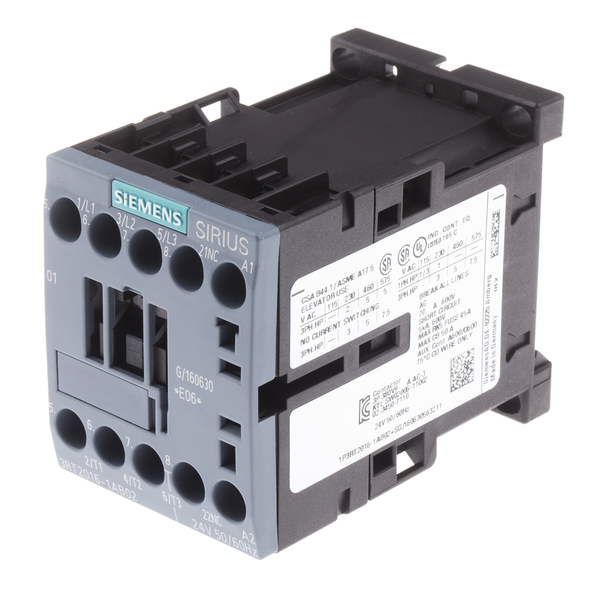 This is Sirius Innovation 3RT2 3 Pole Contactor 3NO 9 A (AC3) 4 kW (AC3) 24 V ac Coil manufactured by Siemens. The manufacturer part number is 3RT2016-1AB02. It has a maximum operating temperature of +60°c. Is it a better world product? yes. The normal state configuration includes 3no. The rated contact current is 9 a. The product size s00, 3rt2, is a highly preferred choice for users. Whereas, the minimum operating temperature of the product is -25°c. The coil voltage of the product is 24 v ac. Its accurate length is 57.5mm. It has 3p pole and throw configuration. The product is available in din rail style. Furthermore, the product is 45mm wide. The product comes in 73mm depth. It is composed of [Number of Auxiliary Contacts] auxiliary contacts. It features sirius 3rt range. Feature 4 kw of power rating. The integrated contact has 400 v ac of voltage rating. It has equipped with 3 poles. The terminal is a screw type.