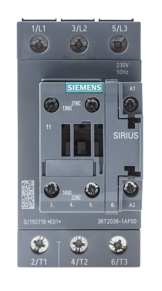 Contactors – 3RT2 Range The 3RT2 contactors are climate-proof and are suitable and tested for use worldwide, sizes S00 to S2, up to 37 kW Size S00, up to 7.5 kW Size S0, up to 18.5 kW Size S2, up to 37 kW Screw connection / Spring Clamp Impulse voltage resistance 6 kV Insulation voltage 690 V Real loss power only 4 W Designation K according to DIN 40719 (extendable to IEC 204-2) & IEC 750; Q according to DIN EN 61346-2 Note Screw terminals can only be used with screw terminal overloads and spring terminals can only be used with spring terminal overloads. Approvals CE, UL, CSA, CCC Siemens Sirius Range Contactor & Control Relays Siemens control gear for feeders up to 5.5kW. The complementary nature of the devices allows fast and simple assembly, for example, of motor starters and reversers. A perfect match between contactors, overloads, circuit breakers and accessories for the same power ratings provides a uniform panel appearance and the standard widths with no side-by-side mounting derating allows for space saving.