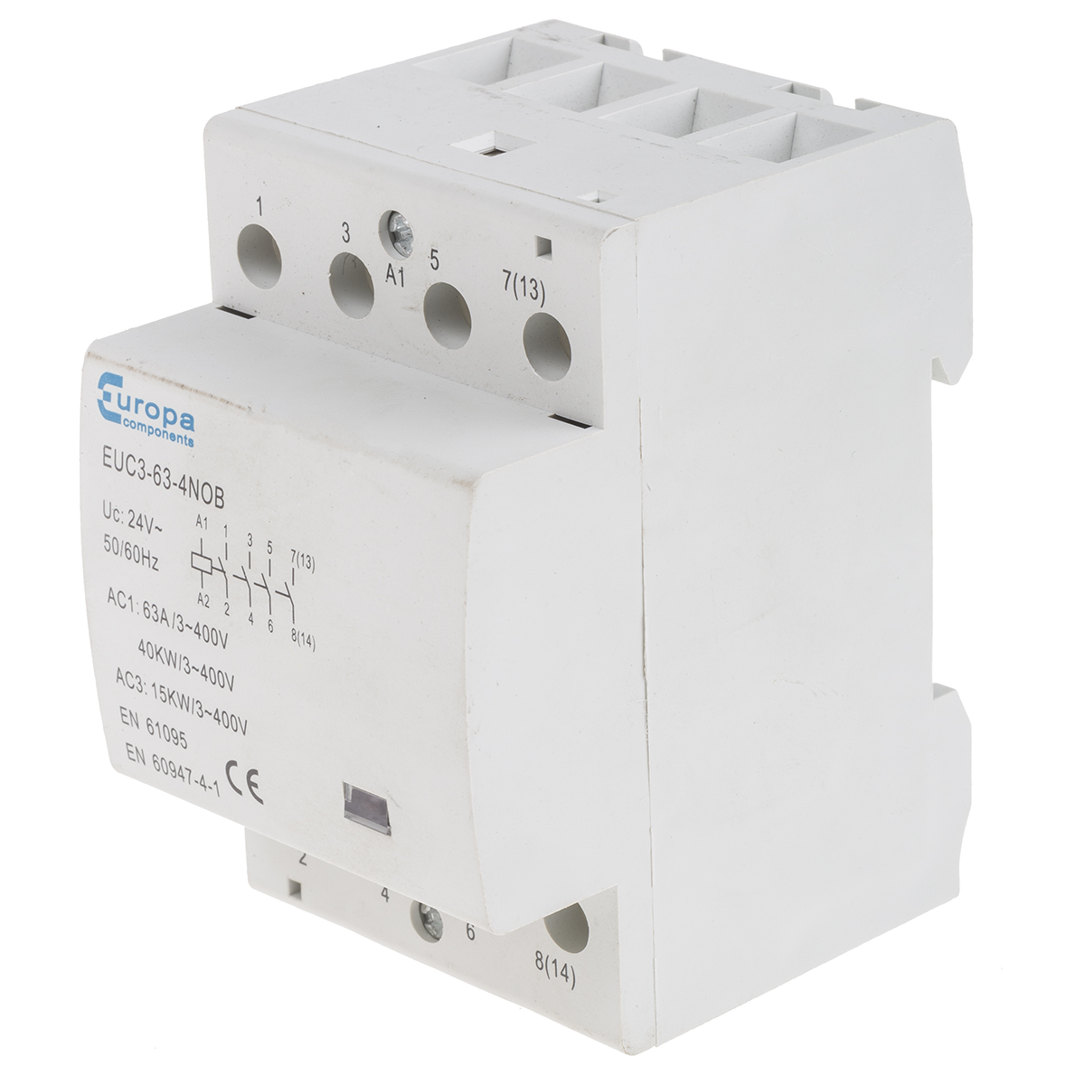 This is 4 Pole Contactor 4NO 63 A 40 kW 24 V ac Coil manufactured by Europa. The manufacturer part number is EUC3-63-4NOB. The rated contact current is 63 a. The coil voltage of the product is 24 v ac. Its accurate length is 54mm. It has 4pst pole and throw configuration. Furthermore, the product is 87.5mm wide. The product comes in 68mm depth. The normal state configuration includes 4no. Feature 40 kw of power rating. The integrated contact has 400 v ac of voltage rating. It has equipped with 4 poles. The terminal is a screw type.