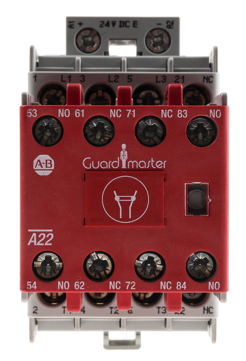 100S-C, 3 Pole Safety Contactors 2N/O & 3N/C The Bulletin 100S-C safety contactors provide mechanically linked positively guided contacts, required in feedback circuits of modern safety applications. The mechanically linked N.C. auxiliary contacts will not change state when a power pole welds. In addition, the gold-plated bifurcated auxiliary contacts are ideally suited for low-energy applications or feedback control circuits with multiple series-connected N.C. auxiliary contacts. Redundant contactors to isolate motor (hazardous motion) Positively guided main contacts Red contact housings for easy identification as safety device Protective cover prevents manual operation - yet the window allows visible ON/OFF status Note DC versions incorporate a diode protection circuit Safety Contactor