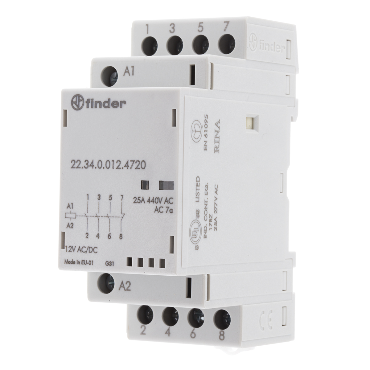 This is 22 Series 4 Pole Contactor 3NO/NC 25 A 2 VA 12 V Coil manufactured by Finder. The manufacturer part number is 22.34.0.012.4720. It has a maximum operating temperature of +50°c. The rated contact current is 25 a. The product 22, is a highly preferred choice for users. Whereas, the minimum operating temperature of the product is -20°c. The coil voltage of the product is 12 v dc. Its accurate length is 35mm. Furthermore, the product is 35mm wide. The product comes in 60.8mm depth. The normal state configuration includes 3no + 1nc. Feature 4 kw of power rating. The integrated contact has 250 v ac, 440 v ac of voltage rating. It has equipped with 4 poles. The terminal is a screw type.