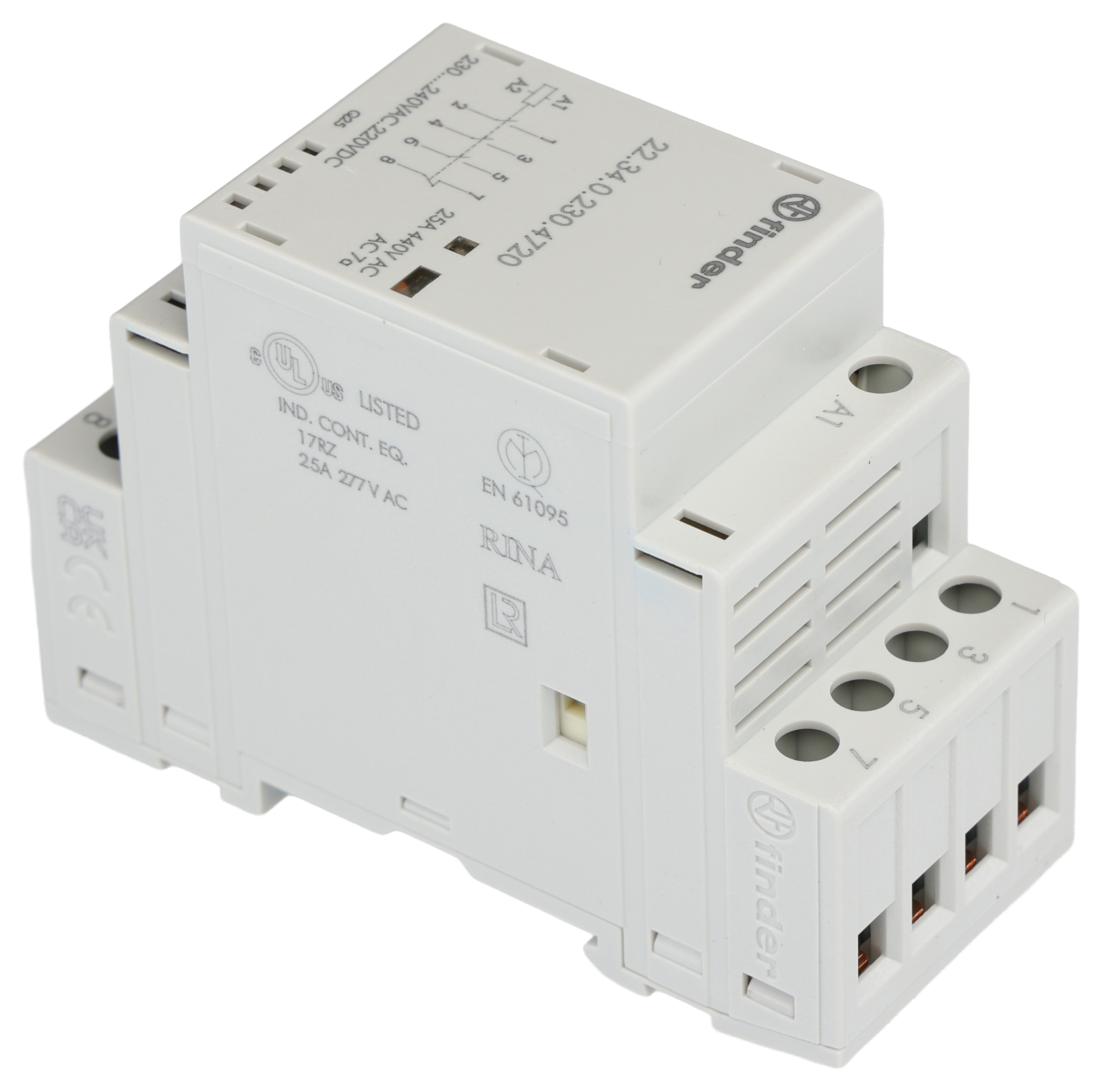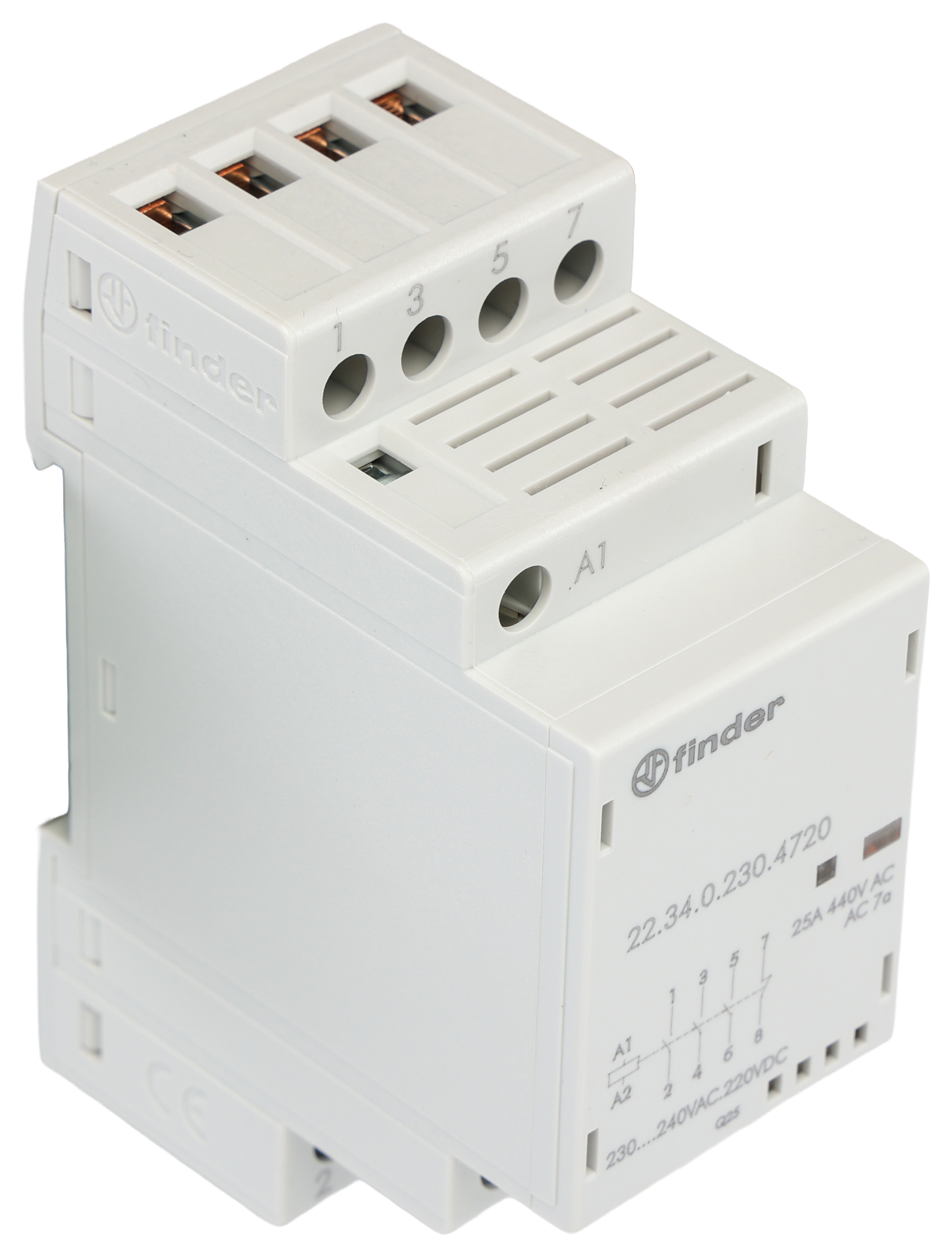 This is 3PDT Non-Latching Relay DIN Rail 240V ac Coil 25 A manufactured by Finder. The manufacturer part number is 22.34.0.230.4720. It has a maximum operating temperature of +50°c. It has a typical 25/120a load current. It has 12 → 230 v ac/dc control voltage . The product 22, is a highly preferred choice for users. Additionally, it can withstand 250/440v ac load voltage . The coil voltage of the product is 230 v ac/dc. Its accurate length is 35mm. The product is available in din rail style. The rated contact current is 25 a. The product comes in 60.8mm depth. The normal state configuration includes 3no + 1nc. Whereas, the minimum operating temperature of the product is -20°c. The integrated contact has 250/440 v ac of voltage rating. It has equipped with 4 poles. The terminal is a screw type.