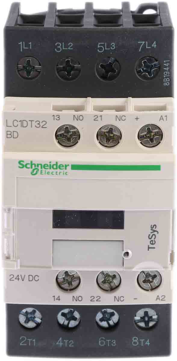 This is Tesys D LC1D 4 Pole Contactor 32 A 24 V dc Coil manufactured by Schneider Electric. The manufacturer part number is LC1DT32BD. The coil voltage of the product is 24 v dc. It has 4p pole and throw configuration. Furthermore, the product is 45mm wide. It features tesys d range. It performs basic function of load control. It has a typical 32a load current. The rated contact current is 32 a. It has a maximum operating temperature of +60°c. Additionally, it can withstand 440v ac load voltage . It has 24 v dc control voltage . Its accurate length is 91mm. Better World Verification Options - green premium. Is it a better world product? yes. The product lc1d, is a highly preferred choice for users. The product comes in 107mm depth. The terminal is a screw type. The product is available in din rail mount style. It is composed of [Number of Auxiliary Contacts] auxiliary contacts. The normal state configuration includes 4no. In addition, it has a standard 1no + 1nc auxiliary contact configuration . The integrated contact has 690 v ac of voltage rating. It has equipped with 4 poles. Whereas, the minimum operating temperature of the product is -40°c.