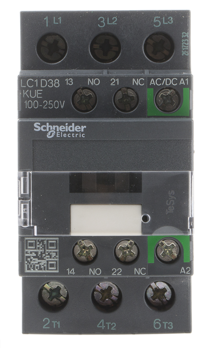 This is TeSys D Green LC1D 3 Pole Contactor 3NO 38 A 18.5 kW V ac @ 380 → 400 manufactured by Schneider Electric. The manufacturer part number is LC1D38KUE. Better World Verification Options - green premium. Is it a better world product? yes. It has a maximum operating temperature of +60°c. The rated contact current is 38 a. The product lc1d, is a highly preferred choice for users. Whereas, the minimum operating temperature of the product is -25°c. The coil voltage of the product is 230 v ac. Its accurate length is 45mm. It has 3pst pole and throw configuration. The product is available in din rail mount style. Furthermore, the product is 92mm wide. The product comes in 85mm depth. It is composed of [Number of Auxiliary Contacts] auxiliary contacts. The normal state configuration includes 3no. It features tesys d range. Feature 18.5 kw of power rating. The integrated contact has 690 v ac of voltage rating. It has equipped with 3 poles. The terminal is a screw type.