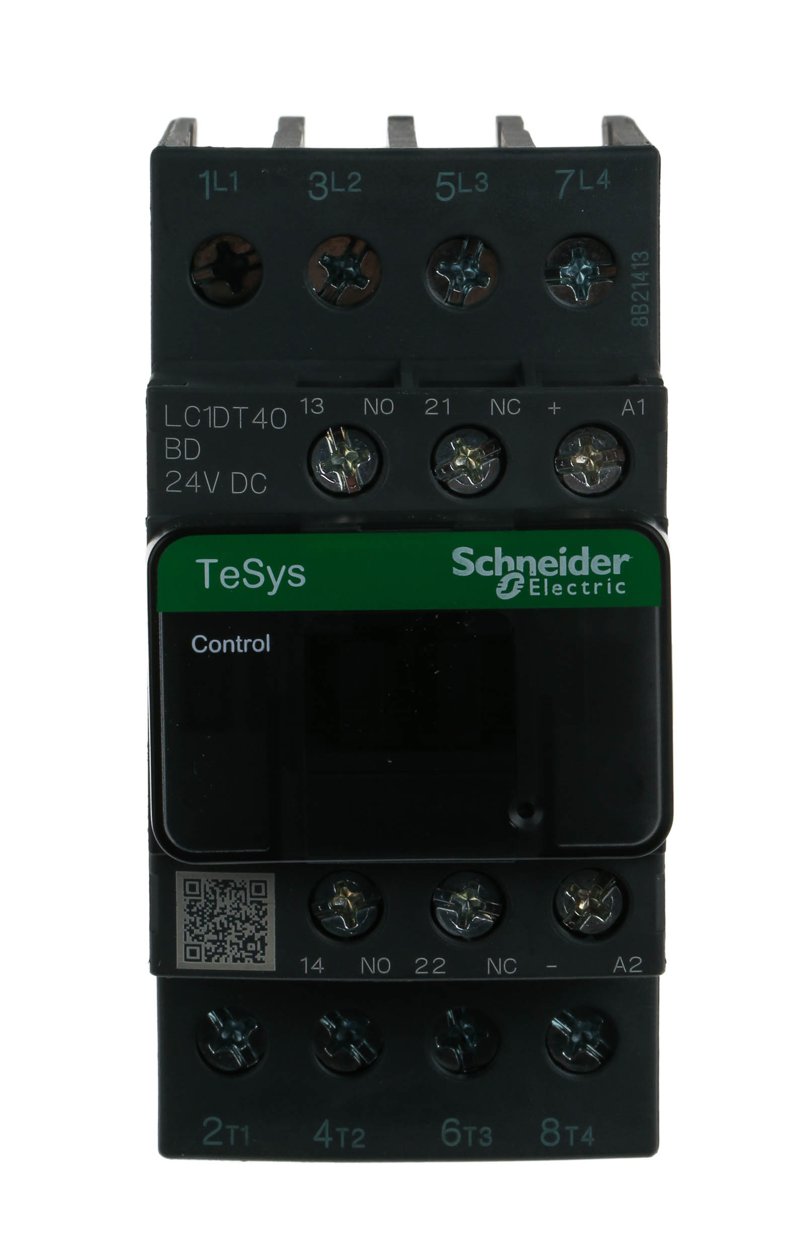 This is Tesys D LC1D 4 Pole Contactor 4NO 40 A 24 V dc Coil manufactured by Schneider Electric. The manufacturer part number is LC1DT40BD. Better World Verification Options - green premium. Is it a better world product? yes. It has a maximum operating temperature of +60°c. The normal state configuration includes 4no. The rated contact current is 40 a. The product lc1d, is a highly preferred choice for users. Whereas, the minimum operating temperature of the product is -40°c. The coil voltage of the product is 24 v dc. Its accurate length is 91mm. Furthermore, the product is 45mm wide. The product comes in 107mm depth. It is composed of [Number of Auxiliary Contacts] auxiliary contacts. It features tesys d range. The integrated contact has 690 v ac of voltage rating. It has equipped with 4 poles. The terminal is a screw type. The product is rohs3 compliant. The coil voltage of the product is 24vdc. Moreover, it has screw terminal terminal style. The product has -40°c ~ 70°c operating temperature range. The product's switching voltage is 690vac, 300vdc - max. In addition, it is reach unaffected. On the other hand, 16.8 vdc is the given crucial/must operating voltage. The schneider electric's product offers user-desired applications. It also has a 4pst-no (4 form a) contact form. Its typical moisture sensitivity level is not applicable. The operating time of the product is 72.45 ms. While the must release voltage is a 2.4 vdc. It has a long 5 weeks standard lead time. It has a contact current rating of 40 a. The splendid features of the product include auxiliary contacts. The product is available in chassis mount, din rail configuration. The product tesys, is a highly preferred choice for users. While 24 ms is its release time. In addition, box is the available packaging type of the product.
