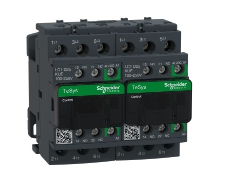 This is Tesys D LC2D 3 Pole Reversing Contactor 3NO 25 A 15 kW @ 660 to 690 V ac 230 V ac Coil manufactured by Schneider Electric. The manufacturer part number is LC2D25KUE. It performs basic function of reversing. Better World Verification Options - green premium. Is it a better world product? yes. The normal state configuration includes 1 no + 1 nc. The rated contact current is 25 a. The product lc2d, is a highly preferred choice for users. The coil voltage of the product is 100 to 250 v ac/dc. It features tesys d range. It has equipped with 3 poles.