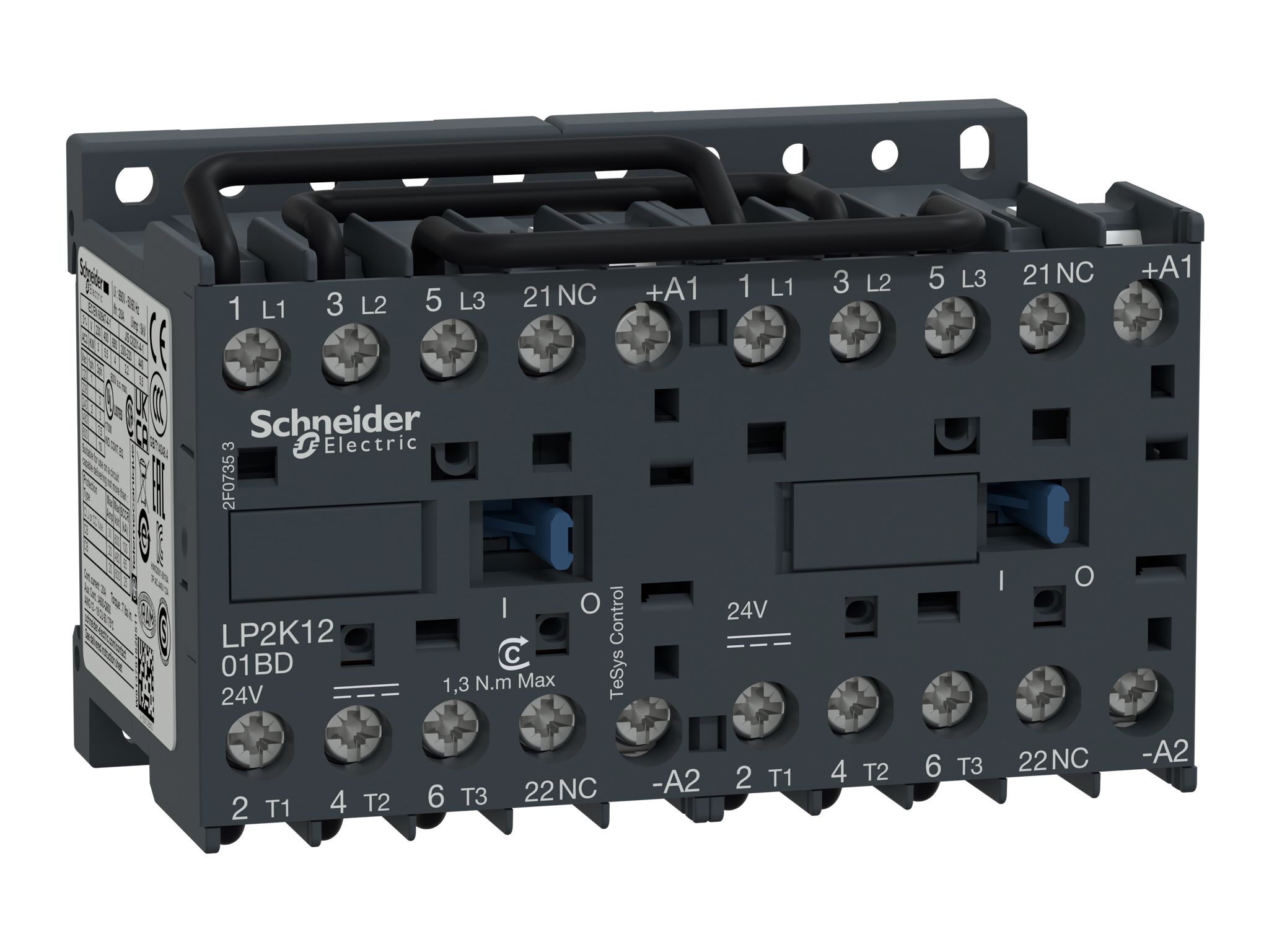 This is TeSys K LP2K 3 Pole Reversing Contactor 3NO (Main) NC (Auxiliary) 12 A 24 V dc Coil manufactured by Schneider Electric. The manufacturer part number is LP2K1201BD. It performs basic function of reversing. Better World Verification Options - green premium. Is it a better world product? yes. It has a maximum operating temperature of +50°c. The normal state configuration includes 3no. The rated contact current is 12 a. The product lp2k, is a highly preferred choice for users. Whereas, the minimum operating temperature of the product is -25°c. The coil voltage of the product is 24 v dc. Its accurate length is 58mm. Furthermore, the product is 90mm wide. The product comes in 57mm depth. It is composed of [Number of Auxiliary Contacts] auxiliary contacts. It features tesys k range. In addition, it has a standard 1nc auxiliary contact configuration . The integrated contact has 690 v ac of voltage rating. It has equipped with 3 poles. The terminal is a screw type.