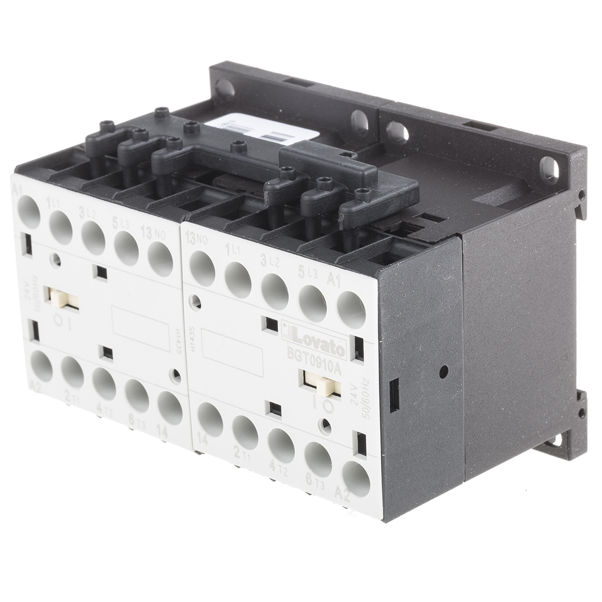 This is Orange BGT09 3 Pole Reversing Contactor 3NO + 1NO 9 A (AC3) 4 kW (AC3 380V - 400V) 24 V ac Coil manufactured by Lovato. The manufacturer part number is 11BGT0910A024. It performs basic function of reversing. The rated contact current is 9 a. The product bg, is a highly preferred choice for users. The coil voltage of the product is 24 v ac. Its accurate length is 88mm. It has 6pst pole and throw configuration. Furthermore, the product is 58mm wide. The product comes in 56mm depth. It is composed of [Number of Auxiliary Contacts] auxiliary contacts. The normal state configuration includes 3no + 1no. It features orange range. Feature 4 kw of power rating. The integrated contact has 600 v ac of voltage rating. It has equipped with 3 poles. The terminal is a screw type.