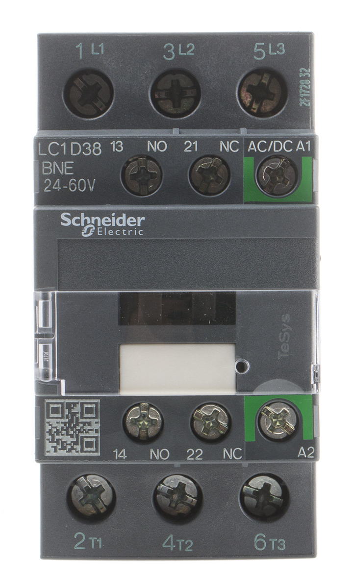 This is TeSys D Green LC1D 3 Pole Contactor 3NO 38 A 18.5 kW V ac @ 380 → 400 manufactured by Schneider Electric. The manufacturer part number is LC1D38BNE. Better World Verification Options - green premium. Is it a better world product? yes. It has a maximum operating temperature of +60°c. The rated contact current is 38 a. The product lc1d, is a highly preferred choice for users. Whereas, the minimum operating temperature of the product is -25°c. The coil voltage of the product is 24 v ac/dc. Its accurate length is 45mm. It has 3pst pole and throw configuration. The product is available in din rail mount style. Furthermore, the product is 92mm wide. The product comes in 85mm depth. It is composed of [Number of Auxiliary Contacts] auxiliary contacts. The normal state configuration includes 3no. It features tesys d range. Feature 18.5 kw of power rating. The integrated contact has 690 v ac of voltage rating. It has equipped with 3 poles. The terminal is a screw type. It is assigned with possible HTSUS value of 8536.41.0045. The coil voltage of the product is 24 ~ 60vac/dc. Moreover, it has screw terminal terminal style. The product has -40°c ~ 70°c operating temperature range. The schneider electric's product offers user-desired applications. It also has a 3pst-no (3 form a) contact form. The operating time of the product is 55 ms. It has a long 5 weeks standard lead time. It has a contact current rating of 38 a. The splendid features of the product include auxiliary contacts. The product is available in chassis mount, din rail configuration. The product tesys, is a highly preferred choice for users. The product's switching voltage is 690vac - max. While 90 ms is its release time. In addition, box is the available packaging type of the product. The product is designated with the ear99 code number.