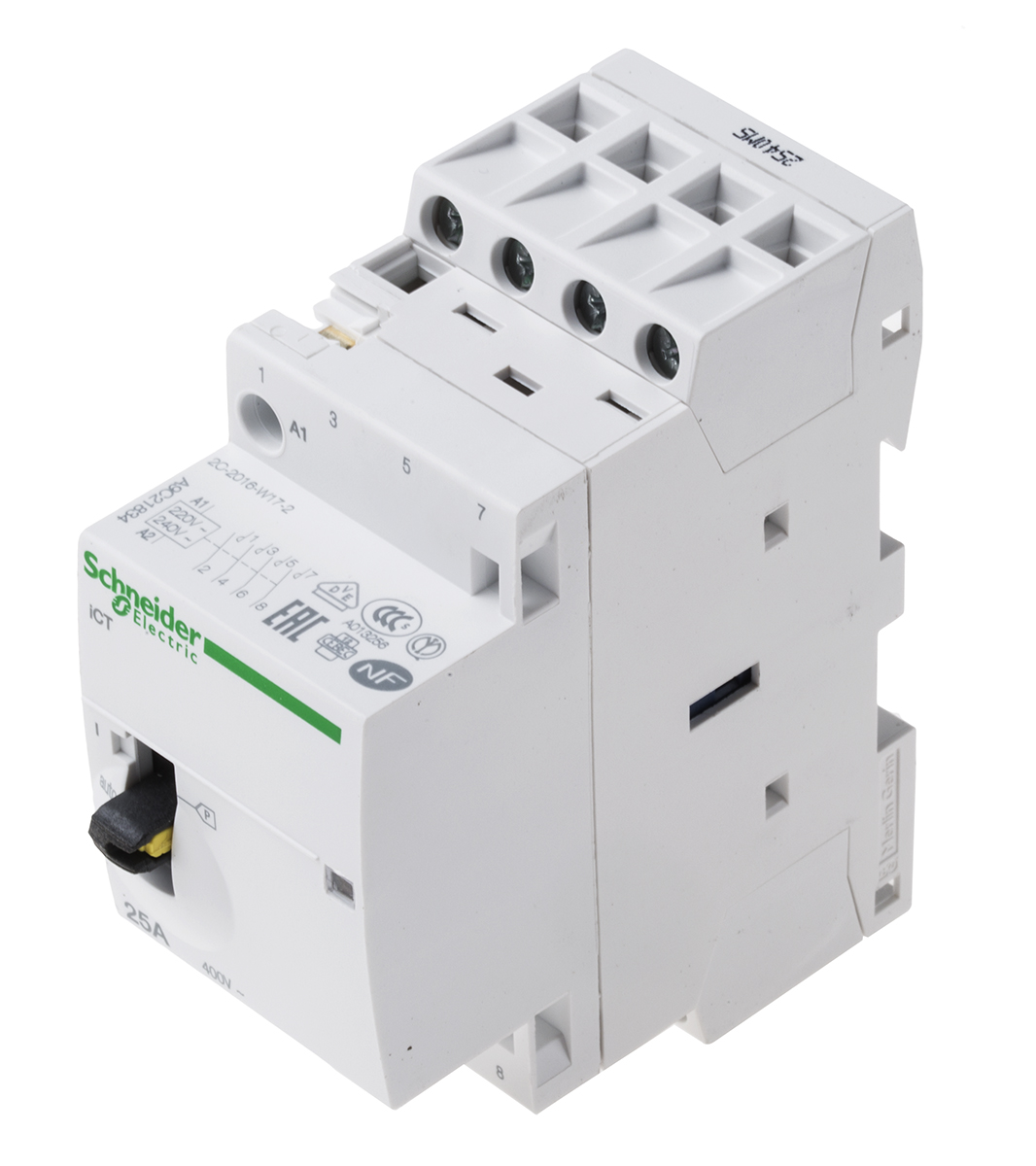 This is Acti 9 iCT Contactor 4NO 25 A 1.6 W 220 → 240 V ac Coil manufactured by Schneider Electric. The manufacturer part number is A9C21834. Better World Verification Options - green premium. Is it a better world product? yes. It has a maximum operating temperature of +60°c. The normal state configuration includes 4no. The rated contact current is 25 a. The product ict, is a highly preferred choice for users. Whereas, the minimum operating temperature of the product is -5°c. The coil voltage of the product is 230 v ac. Its accurate length is 36mm. It has 4p pole and throw configuration. Furthermore, the product is 81mm wide. The product comes in 73mm depth. It features acti9 ict range. The integrated contact has 400 v ac of voltage rating. It has equipped with 4 poles. The terminal is a screw type.