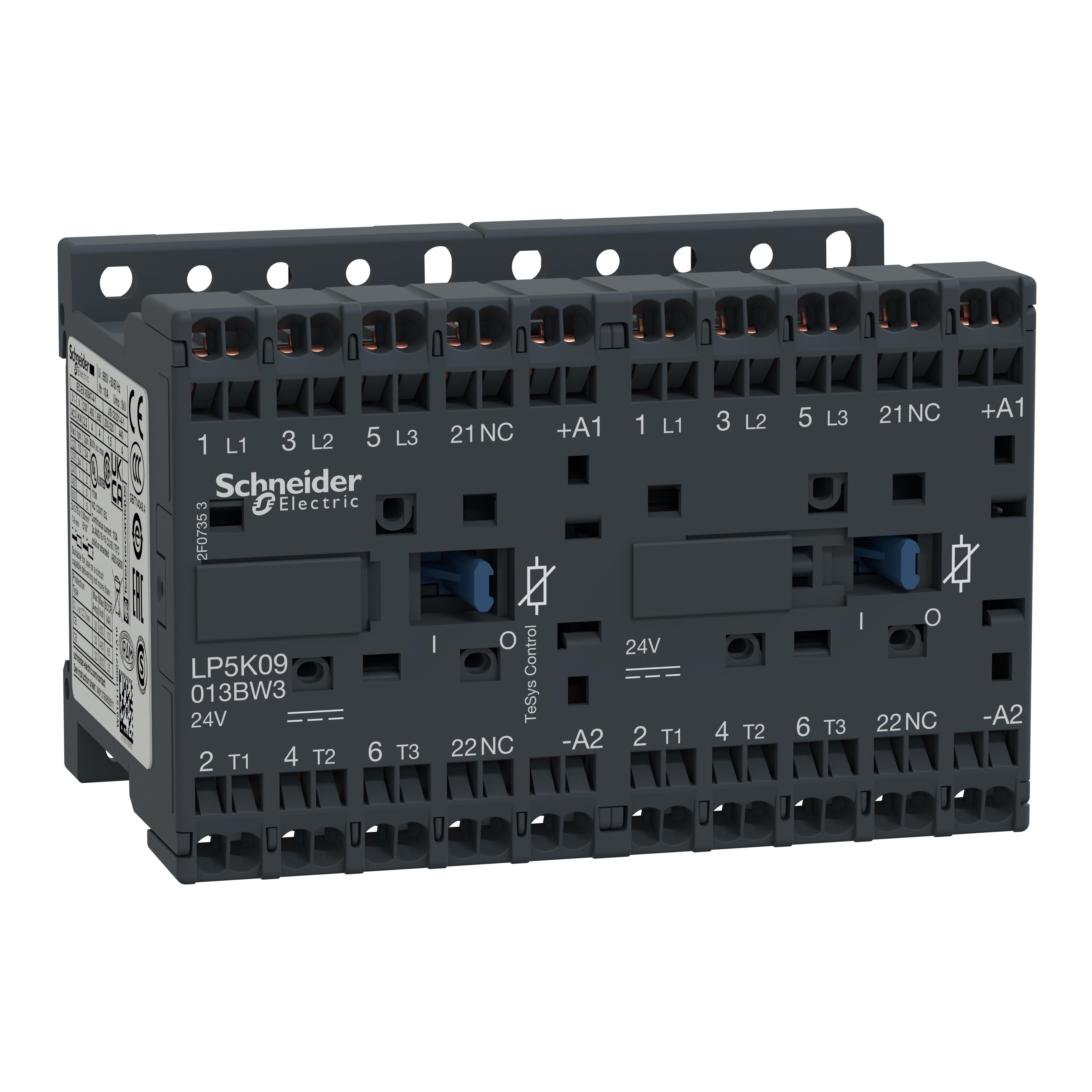 This is TeSys K LP5K 3 Pole Contactor NC (Auxiliary) 20 A 4 kW 24 V dc Coil manufactured by Schneider Electric. The manufacturer part number is LP5K09013BW3. It performs basic function of reversing. Better World Verification Options - green premium. Is it a better world product? yes. It has a maximum operating temperature of +50°c. The rated contact current is 20 a. The product lp5k, is a highly preferred choice for users. Whereas, the minimum operating temperature of the product is -25°c. The coil voltage of the product is 24 v dc. Its accurate length is 58mm. Furthermore, the product is 90mm wide. The product comes in 57mm depth. It is composed of [Number of Auxiliary Contacts] auxiliary contacts. The normal state configuration includes 3no. It features tesys k range. In addition, it has a standard 1nc auxiliary contact configuration . Feature 4 kw of power rating. The integrated contact has 690 v ac of voltage rating. It has equipped with 3 poles. The terminal is a cable type. The coil voltage of the product is 24vdc. Moreover, it has spring terminal terminal style. The product has -25°c ~ 50°c operating temperature range. The product's switching voltage is 690vac - max. On the other hand, 16.8 vdc is the given crucial/must operating voltage. The schneider electric's product offers user-desired applications. It also has a 3pst-no (3 form a) contact form. The operating time of the product is 20 ms. While the must release voltage is a 2.4 vdc. It has a long 5 weeks standard lead time. It has a contact current rating of 9 a. The splendid features of the product include auxiliary contacts, diode. The product is available in chassis mount, din rail configuration. The product tesys, is a highly preferred choice for users. While 40 ms is its release time. In addition, box is the available packaging type of the product.