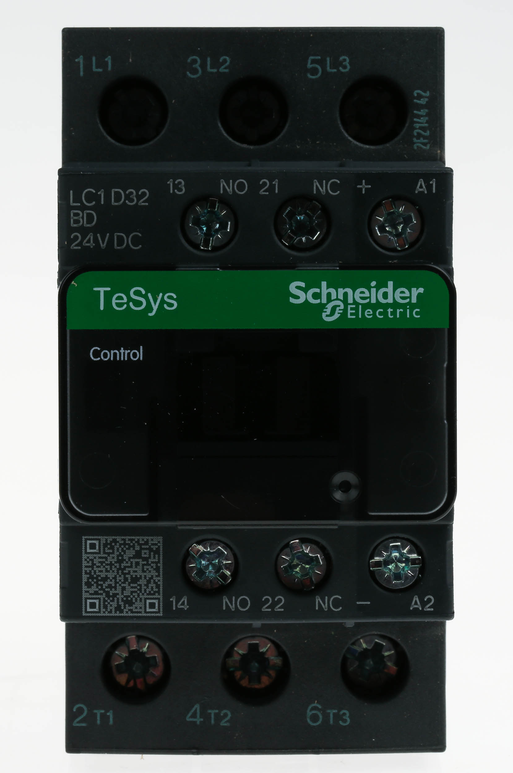 This is Tesys D LC1D 3 Pole Contactor 3NO 32 A 15 kW 24 V dc Coil manufactured by Schneider Electric. The manufacturer part number is LC1D32BD. The coil voltage of the product is 24 v dc. It has 3p pole and throw configuration. Furthermore, the product is 45mm wide. It features tesys d range. It performs basic function of motor control. The rated contact current is 32 a. It has a maximum operating temperature of +60°c. The terminal is a screw type. It has 24 v dc control voltage . Its accurate length is 85mm. Better World Verification Options - green premium. Is it a better world product? yes. The product lc1d, is a highly preferred choice for users. The product comes in 101mm depth. The product is available in din rail style. It is composed of [Number of Auxiliary Contacts] auxiliary contacts. The normal state configuration includes 3no. In addition, it has a standard 1no + 1nc auxiliary contact configuration . Feature 15 kw of power rating. The integrated contact has 690 v ac of voltage rating. It has equipped with 3 poles. Whereas, the minimum operating temperature of the product is -40°c.