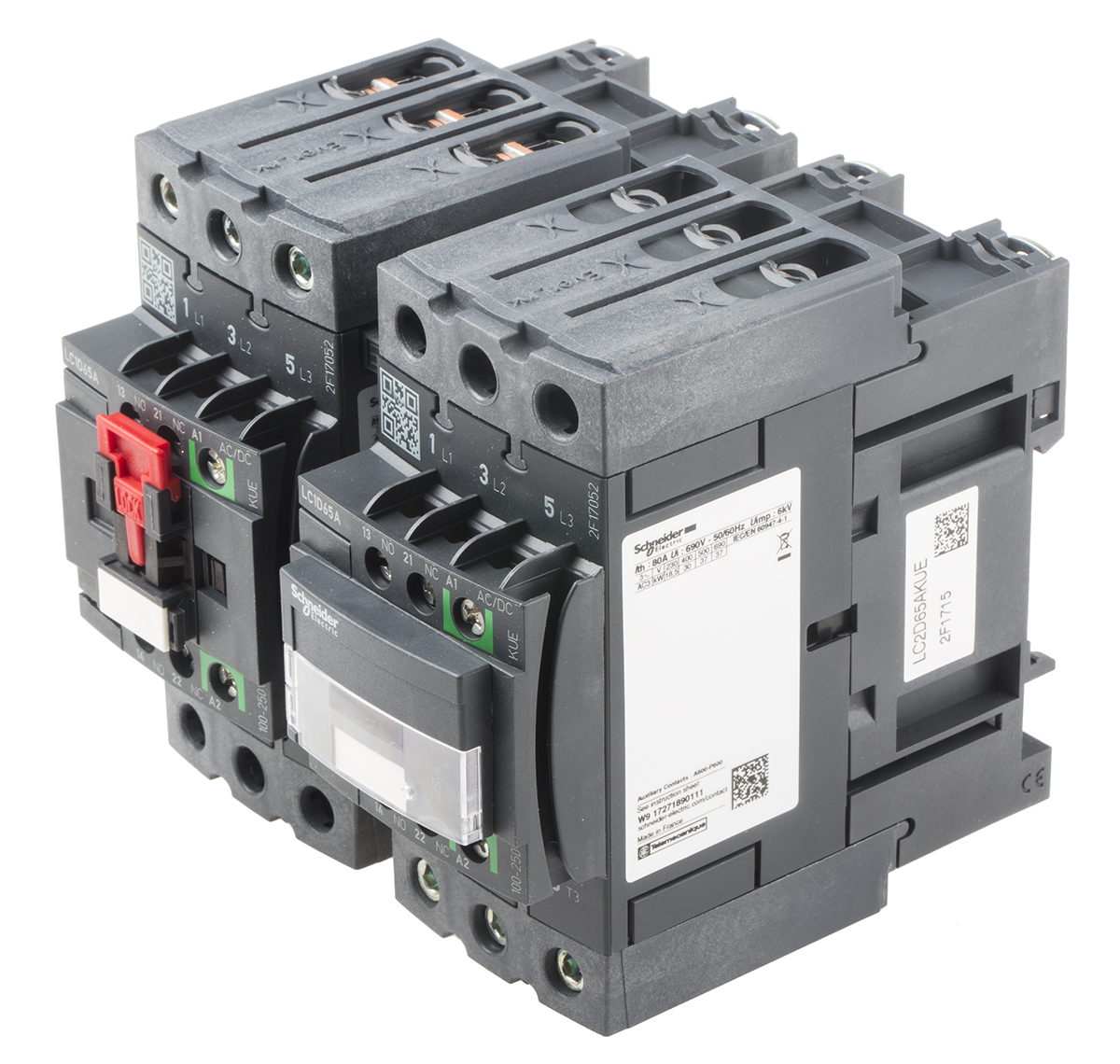 This is Tesys D LC2D 3 Pole Reversing Contactor 3NO 65 A 37 kW @ 660 to 690 V ac 230 V ac Coil manufactured by Schneider Electric. The manufacturer part number is LC2D65AKUE. The coil voltage of the product is 230 v ac. It has 3pst pole and throw configuration. Furthermore, the product is 120mm wide. It features tesys d range. It performs basic function of reversing. The rated contact current is 65 a. It has a maximum operating temperature of +60°c. The terminal is a screw type. The normal state configuration includes 3no. Its accurate length is 119mm. Better World Verification Options - green premium. Is it a better world product? yes. The product lc2d, is a highly preferred choice for users. The product comes in 122mm depth. The product is available in din rail mount style. It is composed of [Number of Auxiliary Contacts] auxiliary contacts. Whereas, the minimum operating temperature of the product is -25°c. In addition, it has a standard 1no + 1nc auxiliary contact configuration . Feature 30 kw of power rating. The integrated contact has 690 v ac of voltage rating. It has equipped with 3 poles.