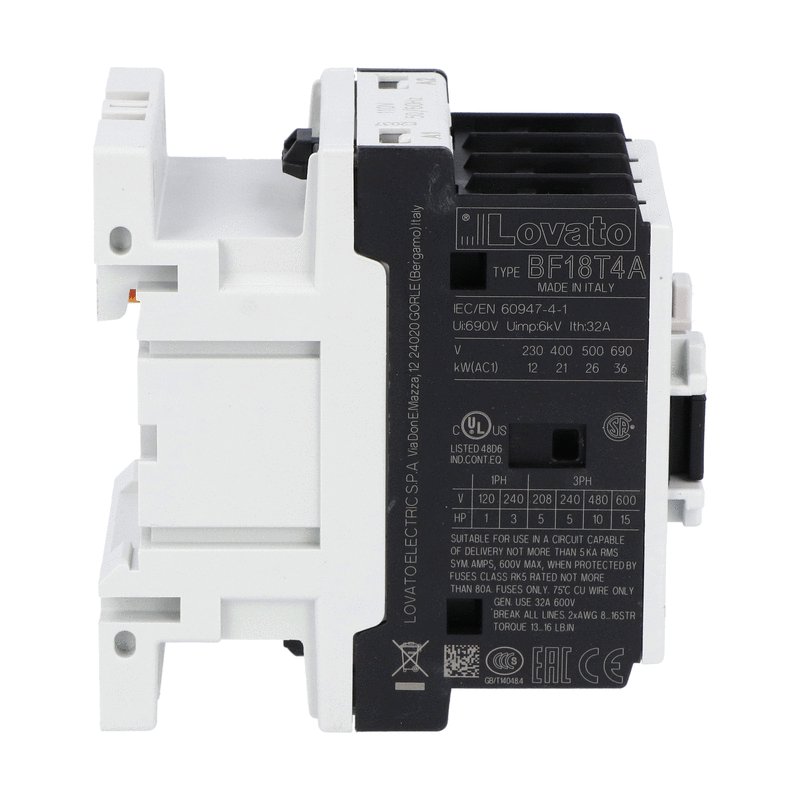 This is 4P CONTACTOR NO 32A AC1 230/50-60 manufactured by Lovato. The manufacturer part number is BF18T4A230. It performs basic function of motor control. It has a maximum operating temperature of 70°c. It has 4pst pole and throw configuration. The product bf, is a highly preferred choice for users. Whereas, the minimum operating temperature of the product is -50°c. The coil voltage of the product is 230 v ac. Its accurate length is 45mm. Furthermore, the product is 80.7 mm wide. The product comes in 81mm depth. The normal state configuration includes 4 no. Moreover, it has about 660, 690v dc contact voltage . Feature 7.5kw of power rating. contactor is a versatile product designed to provide user-defined applications. It has equipped with 4 poles. The terminal is a screw type. It has a din rail type mount .