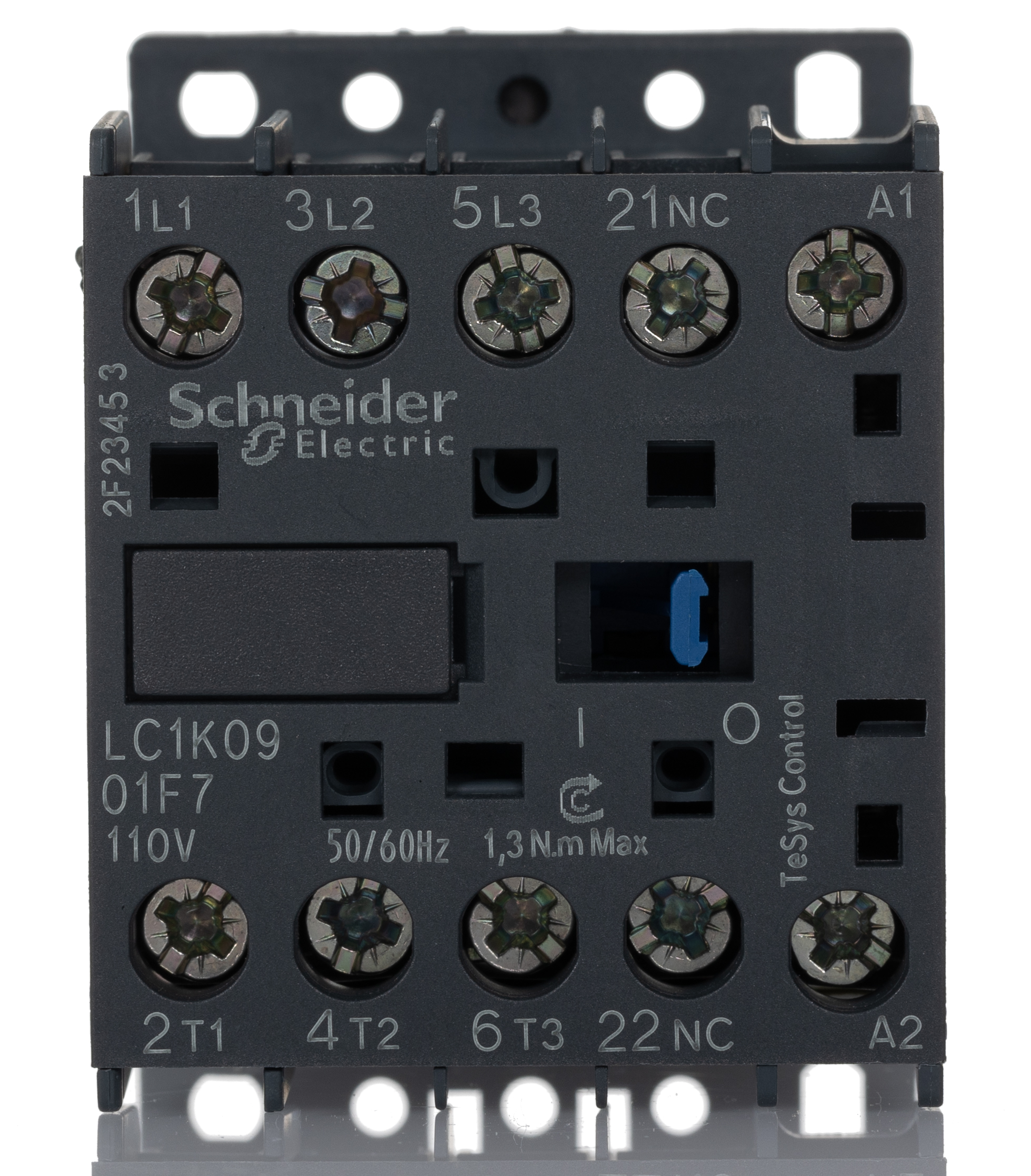 This is Contactor-3NO 9A AC3 poles manufactured by Schneider Electric. The manufacturer part number is LC1K0901F7. The coil voltage of the product is 110 v ac. It has 3p pole and throw configuration. Furthermore, the product is 45mm wide. It features tesys k range. It performs basic function of motor control. The rated contact current is 20 a. It has a maximum operating temperature of +50°c. The terminal is a screw type. It has 110 v ac control voltage . Its accurate length is 58mm. Better World Verification Options - green premium. Is it a better world product? yes. The product lc1k, is a highly preferred choice for users. The product comes in 57mm depth. The product is available in din rail mount style. It is composed of [Number of Auxiliary Contacts] auxiliary contacts. The normal state configuration includes 3no. In addition, it has a standard 1nc auxiliary contact configuration . Feature 4 kw of power rating. The integrated contact has 690 v ac of voltage rating. It has equipped with 3 poles. Whereas, the minimum operating temperature of the product is -25°c. The product is rohs3 compliant. The coil voltage of the product is 110vac. Moreover, it has screw terminal terminal style. The product's switching voltage is 690vac - max. In addition, it is reach unaffected. On the other hand, 88 vac is the given crucial/must operating voltage. The schneider electric's product offers user-desired applications. It also has a 3pst-no (3 form a) contact form. Its typical moisture sensitivity level is not applicable. While the must release voltage is a 22 vac. It has a long 5 weeks standard lead time. It has a contact current rating of 9 a. The splendid features of the product include auxiliary contacts. The product is available in chassis mount, din rail configuration. The product tesys, is a highly preferred choice for users. In addition, box is the available packaging type of the product.