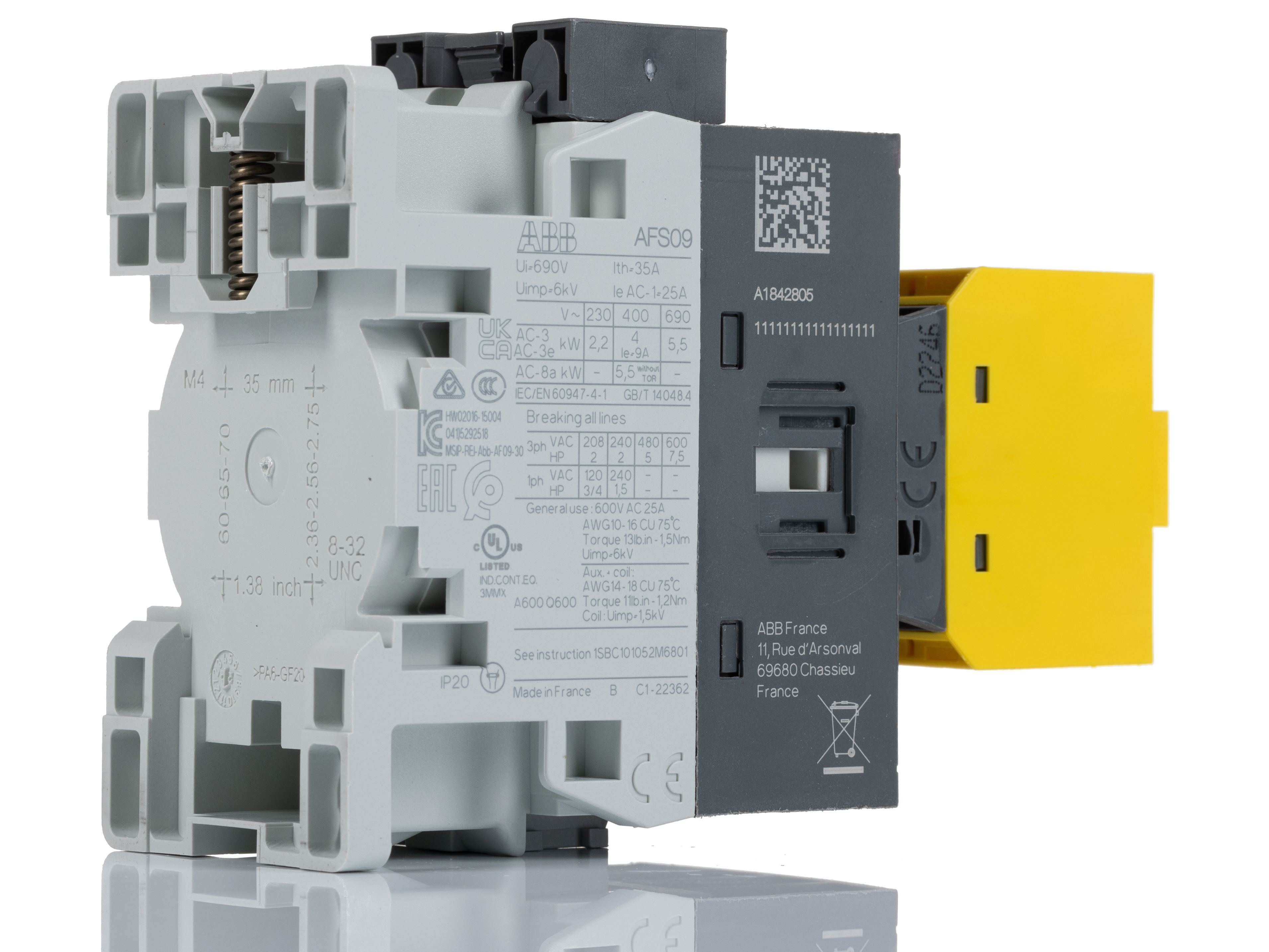 This is AFS 3 Pole Safety Contactor - 25 A 20 → 60 V dc 24 → 60 V @ 50/60 Hz Coil 3NO manufactured by ABB Jokab. The manufacturer part number is 1SBL137082R1122 AFS09-30-22-11. The coil voltage of the product is 24 → 60 v ac. It has 3p pole and throw configuration. Furthermore, the product is 110.5mm wide. It features afs09-30-22-11 range. It performs basic function of safety. It has a typical 25a load current. The rated contact current is 25 a. It has a maximum operating temperature of +60 °c, +70°c. Additionally, it can withstand 690v ac load voltage . Whereas, the minimum operating temperature of the product is -40 °c, -25°c. It has 220 → 240 v ac control voltage . Its accurate length is 45mm. The product afs, is a highly preferred choice for users. The product comes in 80mm depth. The terminal is a screw type. The product is available in din rail mount style. It is composed of [Number of Auxiliary Contacts] auxiliary contacts. The normal state configuration includes 3no. In addition, it has a standard 2no + 2nc auxiliary contact configuration . Feature 5.5 kw of power rating. The integrated contact has 600 v ac of voltage rating. It has equipped with 3 poles.