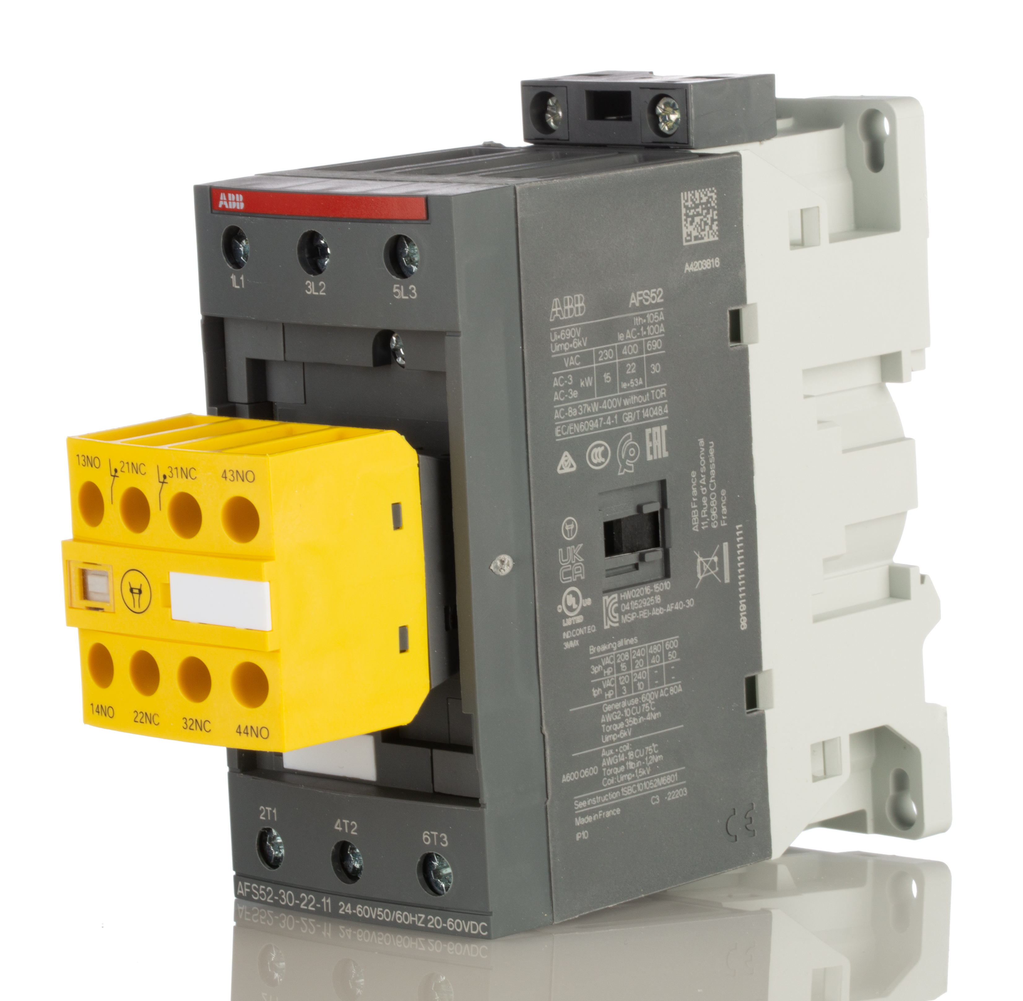 This is AFS 3 Pole Safety Contactor - 100 A 20 → 60 V dc 24 → 60 V @ 50/60 Hz Coil 3NO manufactured by ABB Jokab. The manufacturer part number is 1SBL367082R1122 AFS52-30-22-11. It performs basic function of safety. It has a maximum operating temperature of +60 °c, +70°c. The rated contact current is 100 a. The product afs, is a highly preferred choice for users. Whereas, the minimum operating temperature of the product is -40 °c, -25°c. The coil voltage of the product is 24 → 60 v ac. Its accurate length is 55mm. It has 3p pole and throw configuration. Furthermore, the product is 144mm wide. The product comes in 119.5mm depth. It is composed of [Number of Auxiliary Contacts] auxiliary contacts. The normal state configuration includes 3no. It features afs52-30-22-11 range. In addition, it has a standard 2no + 2nc auxiliary contact configuration . Feature 22 kw of power rating. The integrated contact has 600 v ac of voltage rating. It has equipped with 3 poles. The terminal is a screw type.
